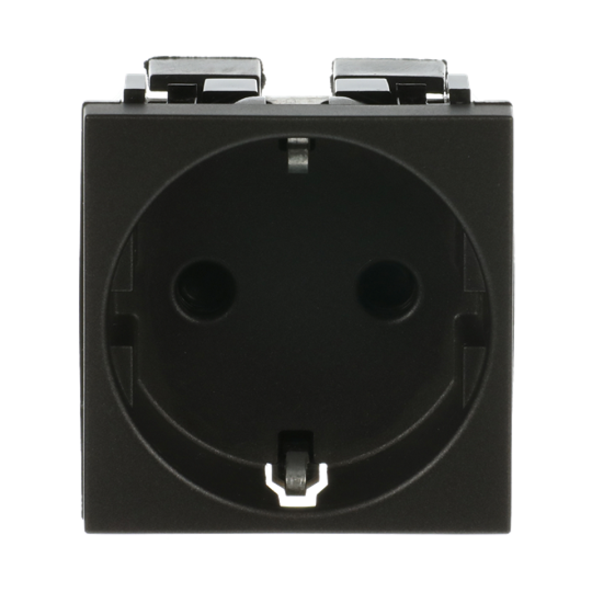 Color: Anthracite. Rated voltage: 250 Vac Rated current: 16A Type F: 2P + E Shuttered for child safety Screwless terminals Size: 2 modules.