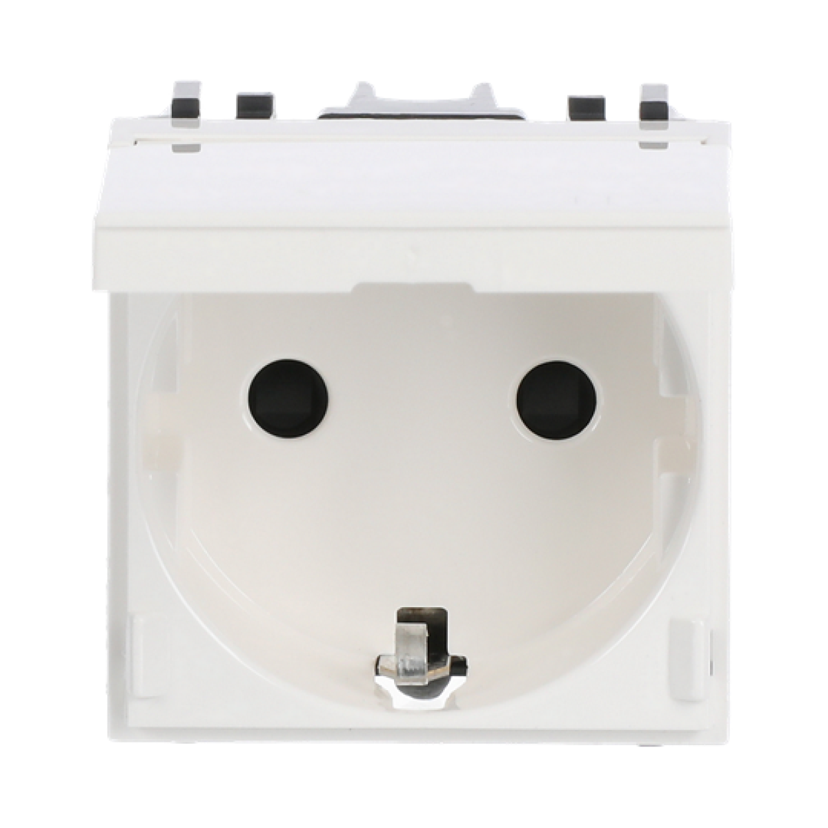 Color: White. Rated voltage: 250 Vac Rated current: 16A Type F: 2P + E Shuttered for child safety Screw terminals Lid with notch. 180º opening Size: 2 modules.