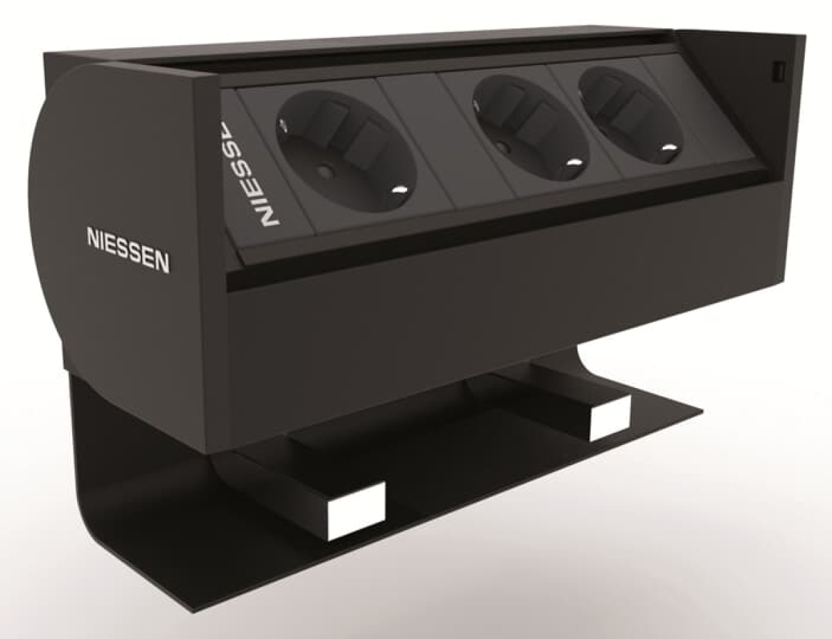 3 socket outlets fully wired with 2,5mm2 halogen free cable. Power input through cable with male rapid connector at end. Fixation system by means of adjustable clamps (1mm-30mm). Mounted on aluminium profile.