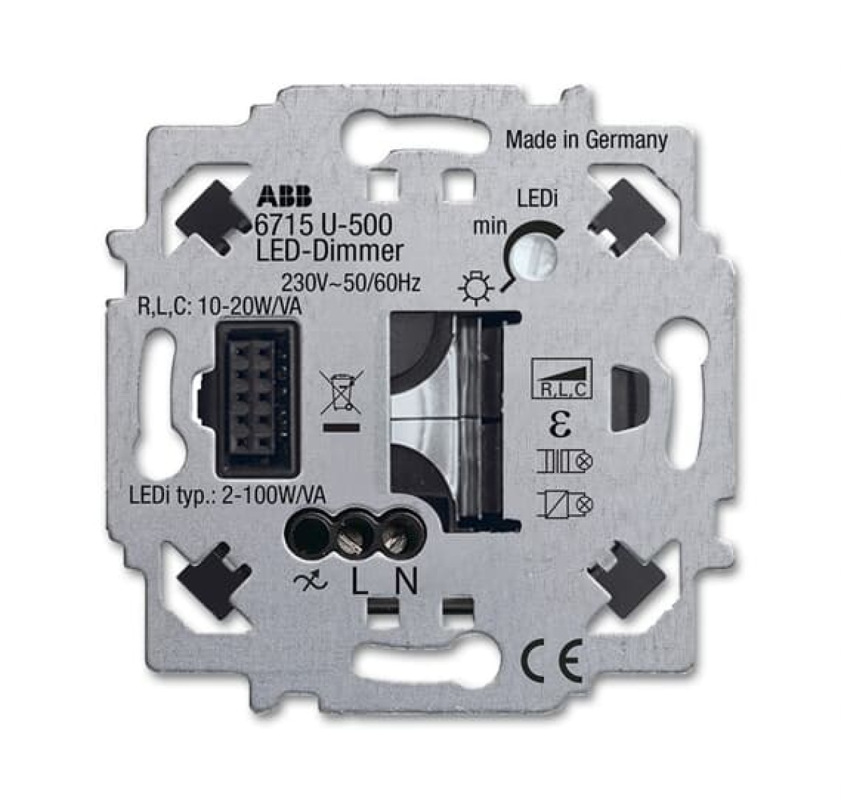 Touch dimmer. For wireless switching and dimming of electrical loads. 3 wire connection (neutral conductor required). Optimised for dimming of retrofit LED lamps (LEDi). For incandescent lamps, 230V tungsten halogen lamps and low-voltage halogen lamps with conventional transformers or electronic transformers and dimmable halogen energy-saving lamps. Mix operaton of LEDi with conventional loads possible. With adjustable minimum brightness. The minimum brightness for the leading edge control can be adjusted using the potentiometer. The potentiometer at the left limit stop corresponds with the trailing edge control mode. Low-noise level by MOSFET transistors. Short-circuit-proof and overload-protected (electronic fuse). With light-level memory and minimum brightness memory. Without control cover. For ZigBee Light Link control element 6735-xxx, 6736-xxx and 6737-xxx. Nominal power: 2 - 100 W/VA (retrofit LED loads). Nominal power: 10 - 200 W/VA (non-LED loads).