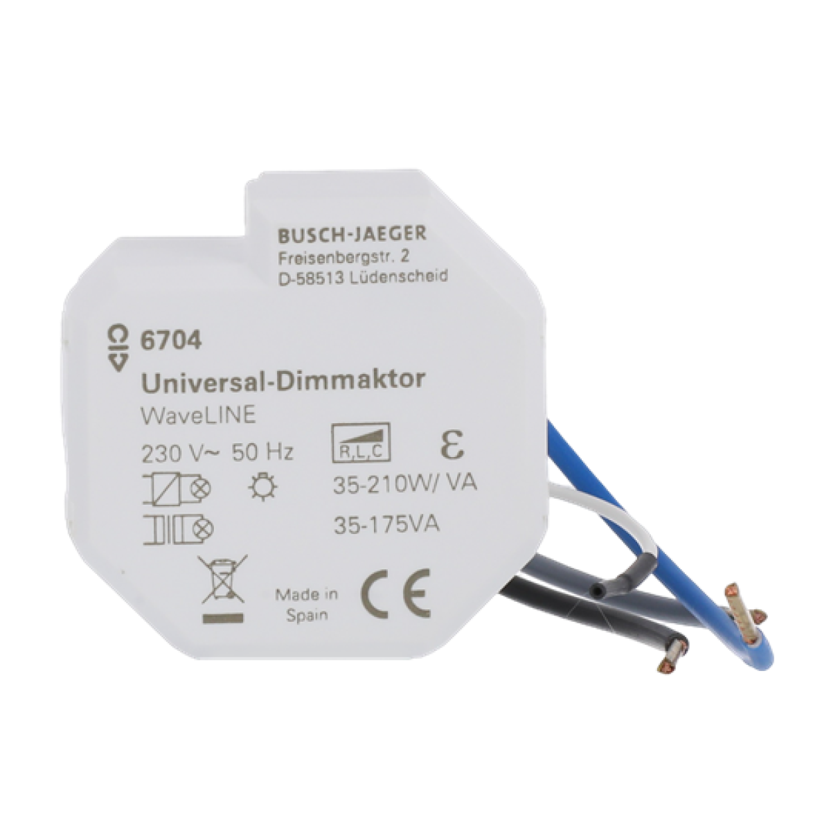 For wireless switching and dimming of electrical loads. For functions ON/OFF, dimming and lightscene control. With soft ON/OFF function. With selectable light value storage. For wall mounted transmitter Waveline 6731-xxx, 6732-xxx und 6733-xxx. For remote control WaveLINE 6780. Repeater function can be activated for extended range. For universal attachment or installation. 2-wire connection (neutral conductor not required) 3-wire connection system (neutral conductor is required) is preferred when using electronic transformers. For installation in (deep) flush-mounted boxes to German Standard DIN 49073. Controllable up to 32 transmission addresses. Send/receive frequency: 868 MHz. Free-field range: approx. 100 m.