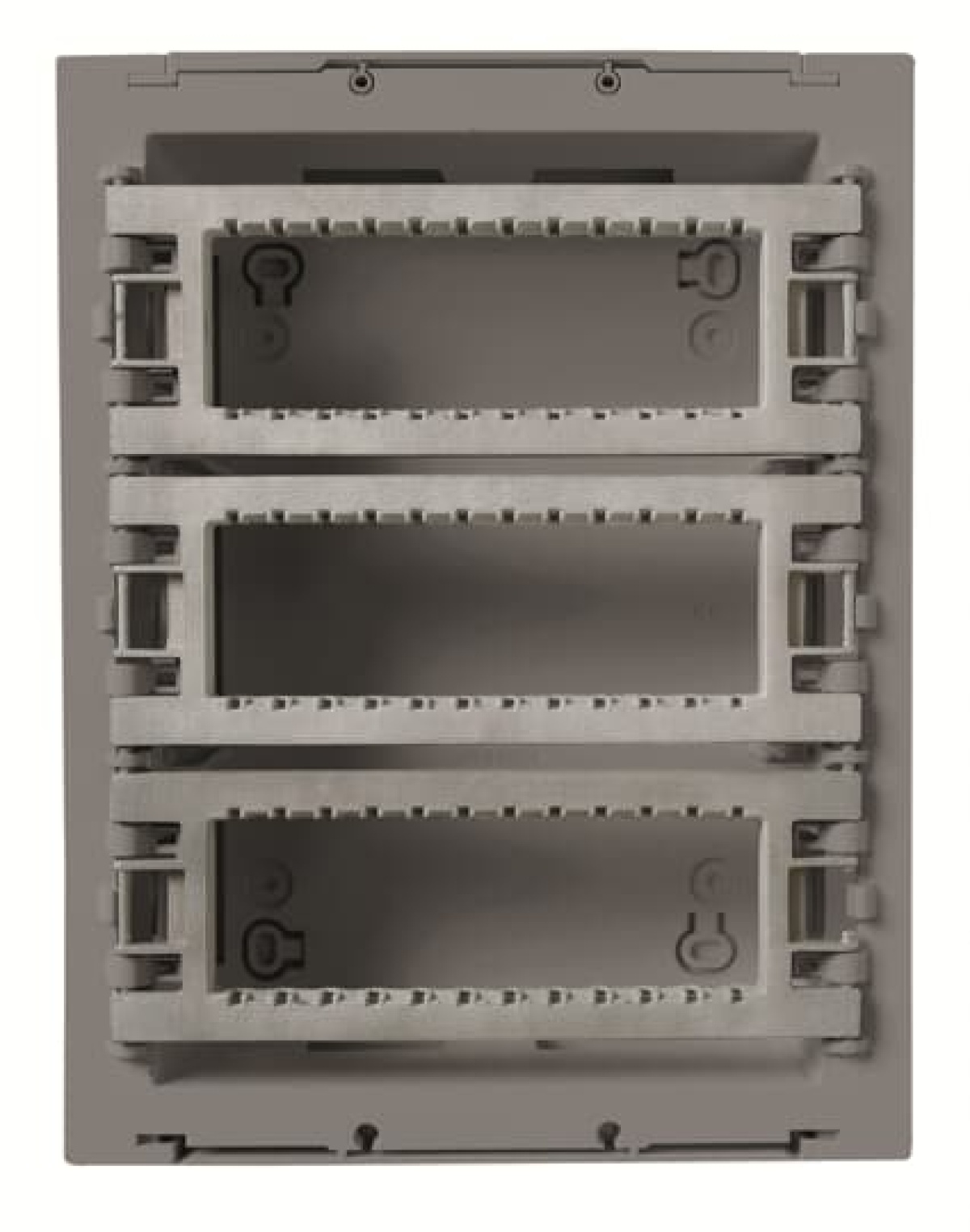 Color: Anthracite Zenit centralization box for surface mounted installations. 3-gang - 6+6+6 modules. For 1, 2 or 3 module devices. Size (height x width x depth): 275 x 212 x 55 mm Included: - Metallic mounting plates (horizontally folding for easy installation) - Screws - Plugs Suitable for frames code: T1273.