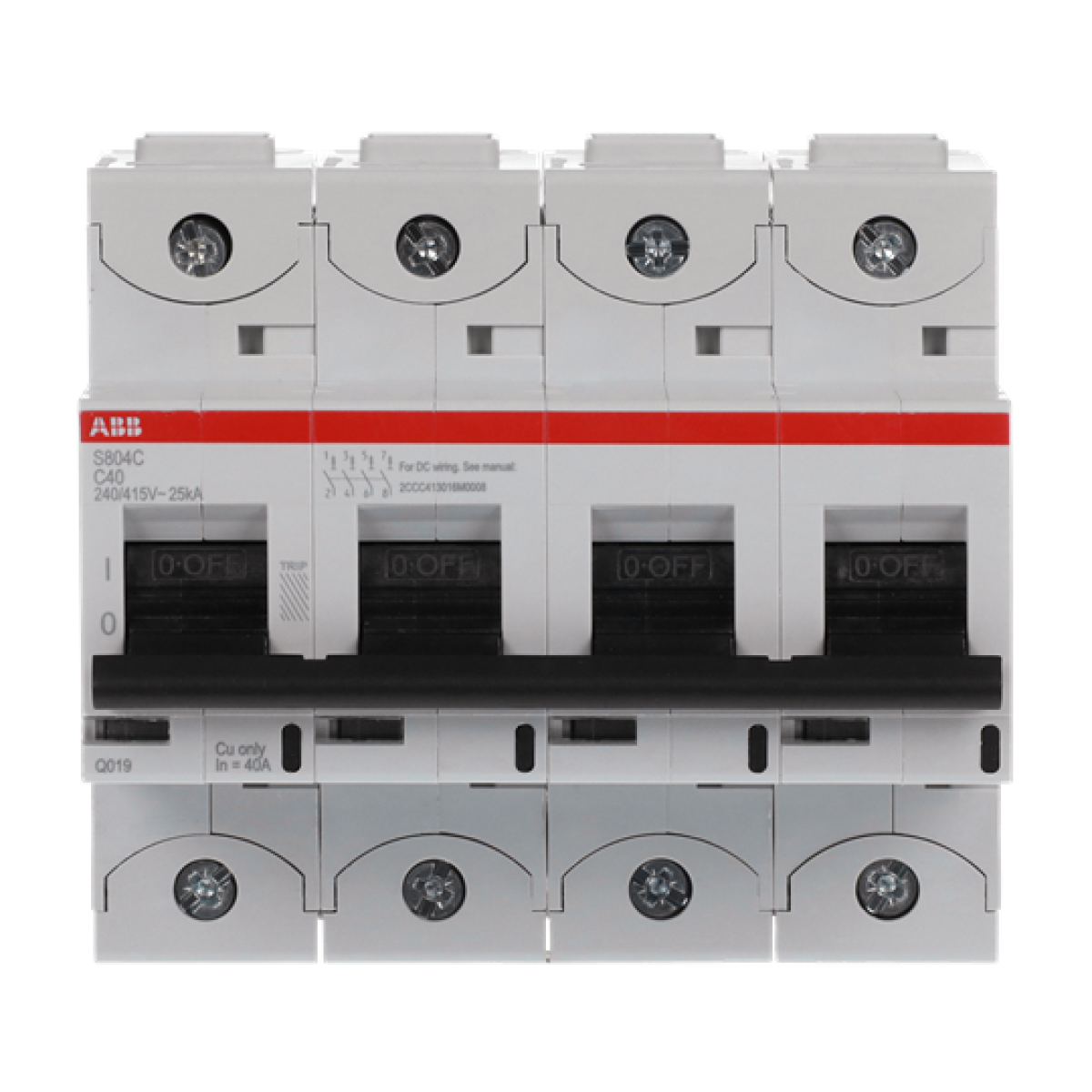 The S804C-C40 is a 4-pole High Performance Circuit breaker with C-characteristic, with cage terminal and a rated current of 40 A. It is a current limiting device with a maximum breaking capacity of 25kA at 240/415V. It can be used for voltages up to 254/440V and in DC as well. It has two different tripping mechanisms, the thermal tripping mechanism for overload protection and the electromechanic tripping mechanism for short circuit protection. The S804C-C40 complies with IEC/EN 60898-1 and IEC/EN 60947-2 and allows the use for residential, commercial and industrial applications. It has numerous of approvals, therefore it can be used worldwide. The extensive range of accessory makes the use of S804C-C40 more comfortable. Due to the fast arc extinction of S804C-C40 your application will be secured.