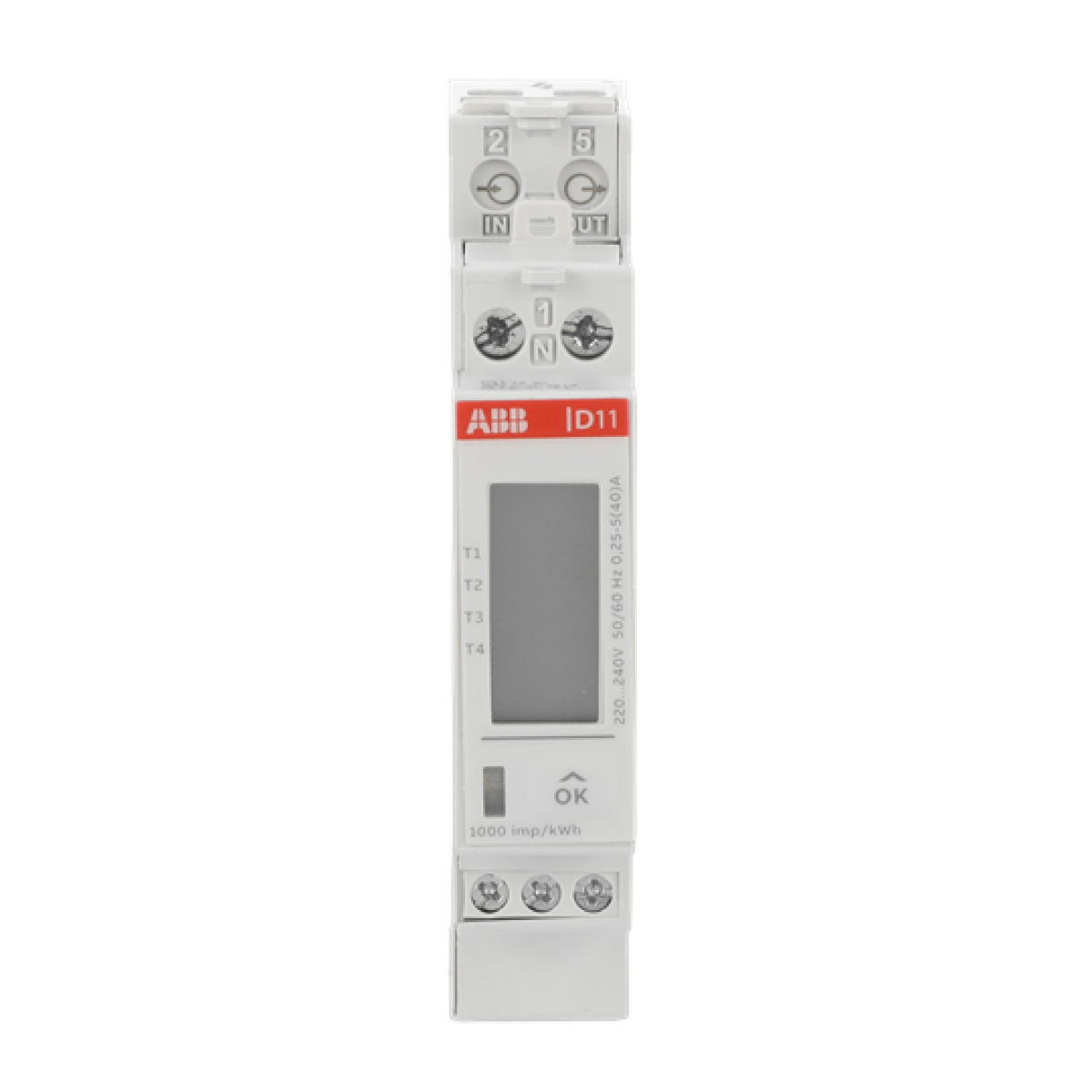 D11 15 40 is a single phase energy meter, direct connection up to 40 A, four quadrant metering, class 1 accuracy for active energy according to IEC 62053-21 and class 2 for reactive energy according to IEC 62053-23, one digital input and one digital output, only one DIN module in width and housing in recycled plastic.