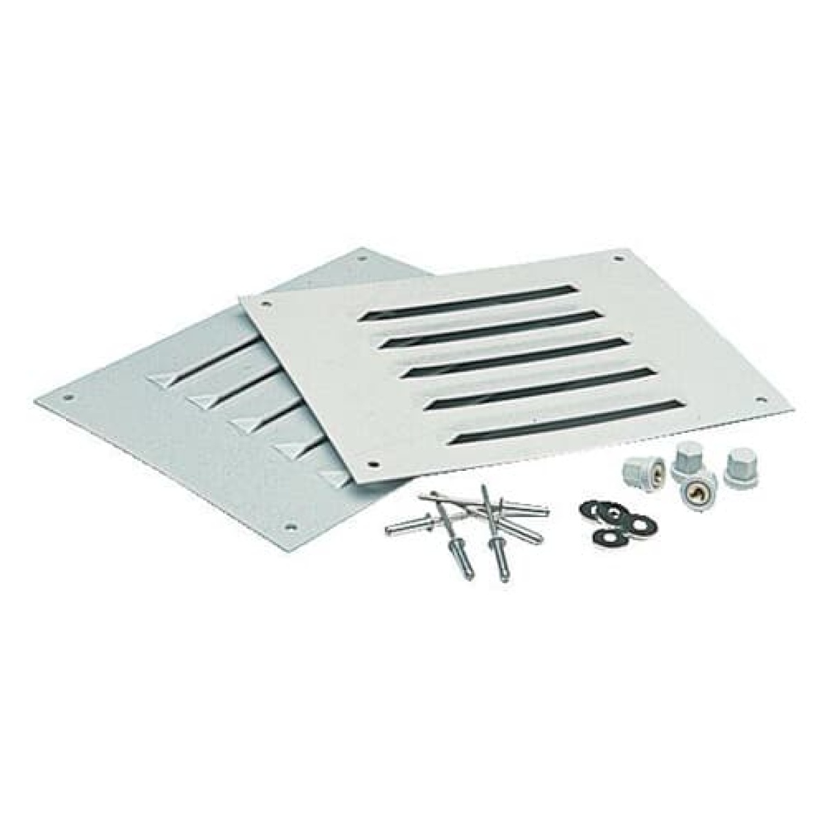 General accessories Ventilation and heating. PSKB2 Gill plate 150x190 IP44 3000 mm2 Set=2pcs. Outside aluminium inside plastic. A set includes 2 grids (1 each of plastic and aluminium) and 4 rivets with plastic counterpart.