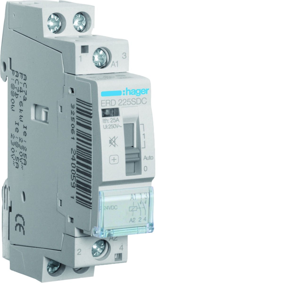 Relé ERD225SDC com corrente nominal de 25A e tensão de bobina de 24 V DC em uma largura de módulo. O relé possui dois contatos normalmente abertos (NA). O relé da Hager tem uma longa vida útil com 100.000 comutações mecânicas e 30.000 comutações elétricas. Disponível em variantes com tensões de bobina de 8 / 12, 24 e 230 V.