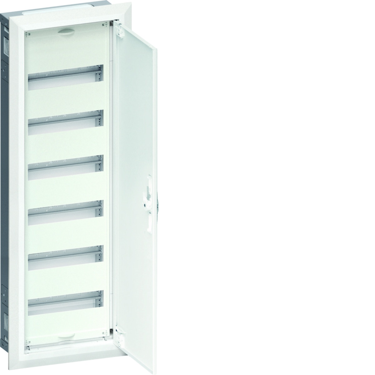 Armário FWBU61S embutido com porta, 6 filas na altura e um campo com espaço para 72 módulos. O gabinete possui classe de proteção IP30 e classe de segurança II, além das dimensões 952x353x125 mm. A cápsula é especialmente adequada para uso como centro de distribuição elétrica em edifícios residenciais e locais públicos, pois há a possibilidade de combinar uma variedade de produtos de segurança e automação predial. A série de cápsulas está disponível para até 252 módulos.