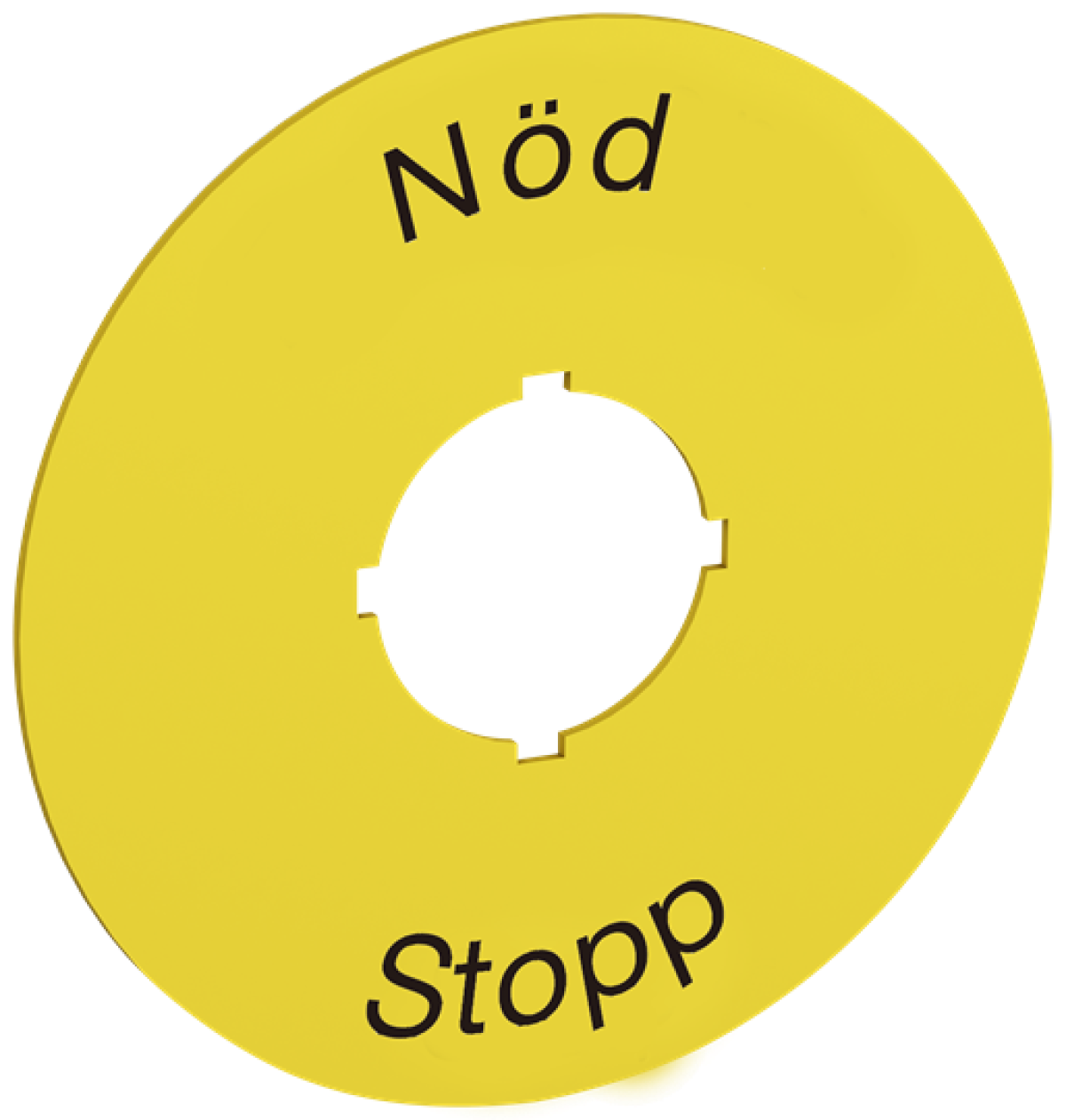 70 mm diameter legend plate for emergency stop. Black text on yellow aluminum with text Nöd Stopp Legend Plate