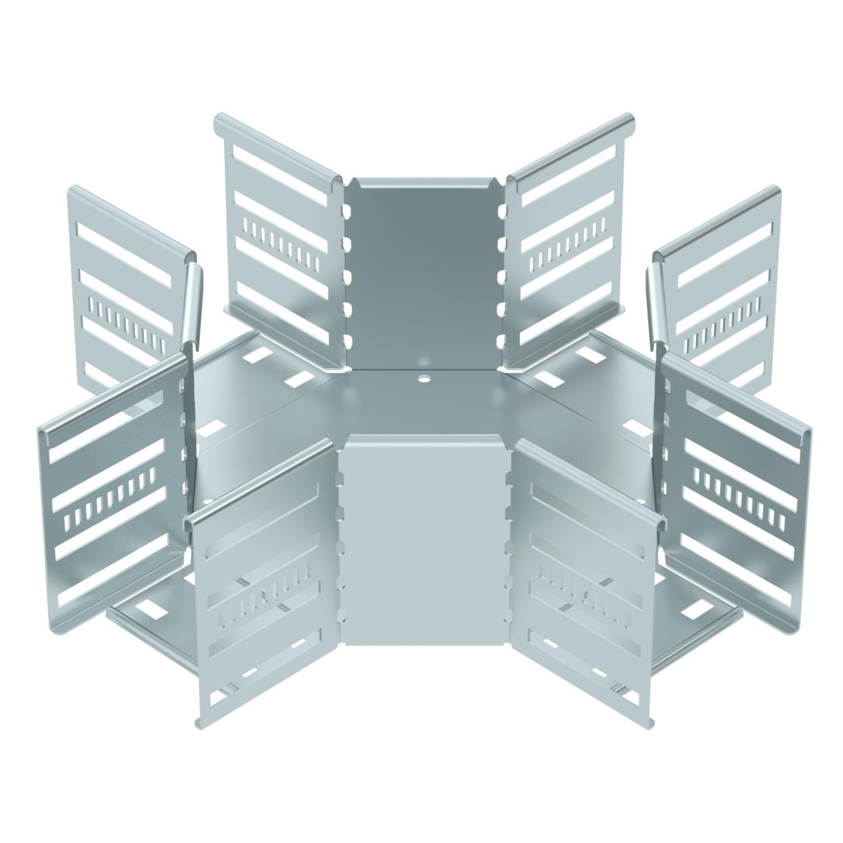 Cruzeta para a criação de um ramal horizontal, para caminhos de cabos em chapa de encaixe e de aparafusar, altura lateral de 110 mm. Montagem sem parafusos com grampos duplos ou ligação roscada com parafusos de cabeça boleada FRS e porcas combinadas M6. Aplicável em áreas interiores. O material de fixação terá que ser encomendado em separado.