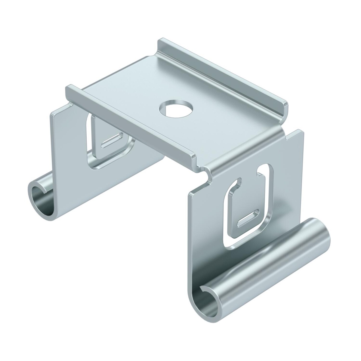 Suspensão central para caminhos de cabos em chapa para pendurar nas abas laterais do caminho de cabos em chapa.