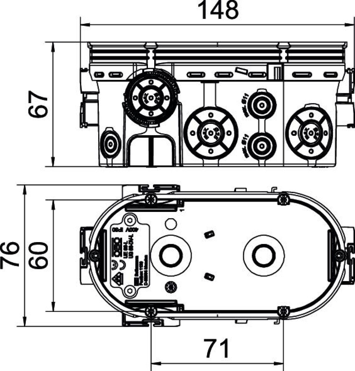 Caixa de aparelhagem de encastrar dupla com entradas de membrana herméticas, para utilização em alvenaria com uma profundidade de instalação de pelo menos 67 mm. • Com 4 uniões de ligação acopláveis com fecho de baioneta • 4 entradas de tubos combinadas Ø 20 e 25 mm • 4 entradas até Ø 20 mm • 14 entradas até Ø 11 mm • 2 entradas até Ø 20 mm na base