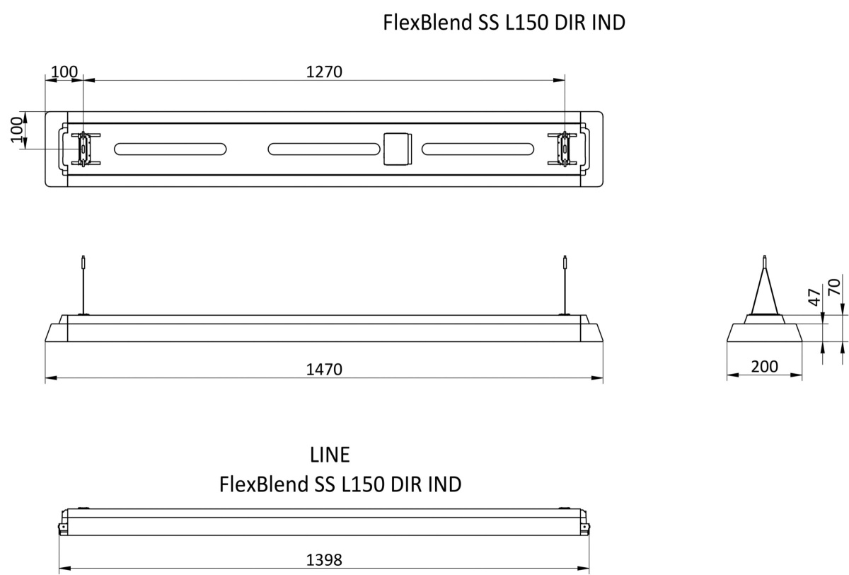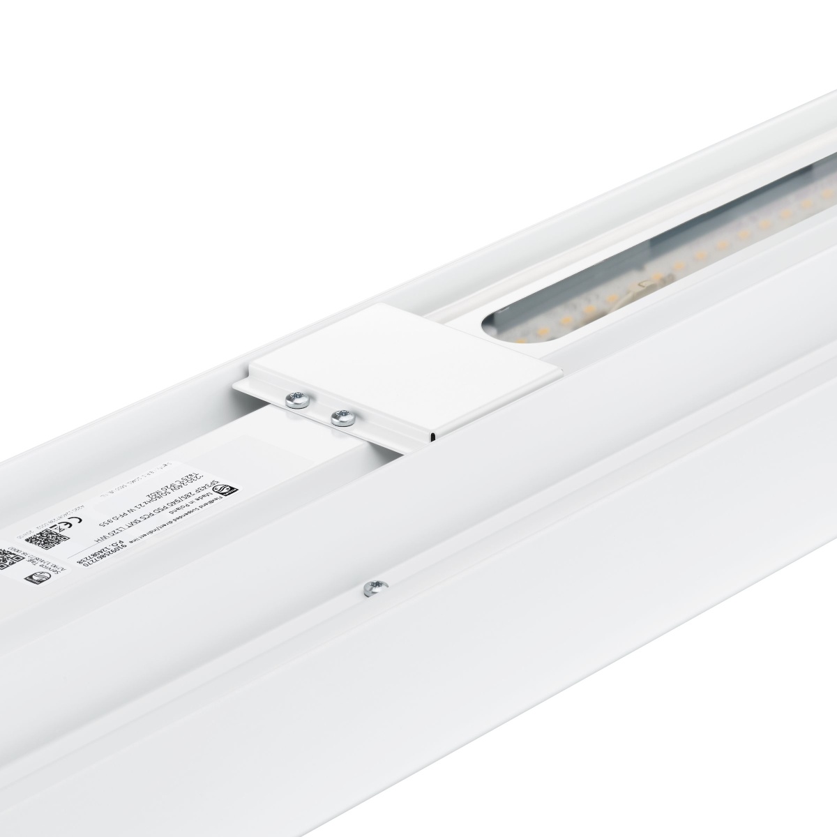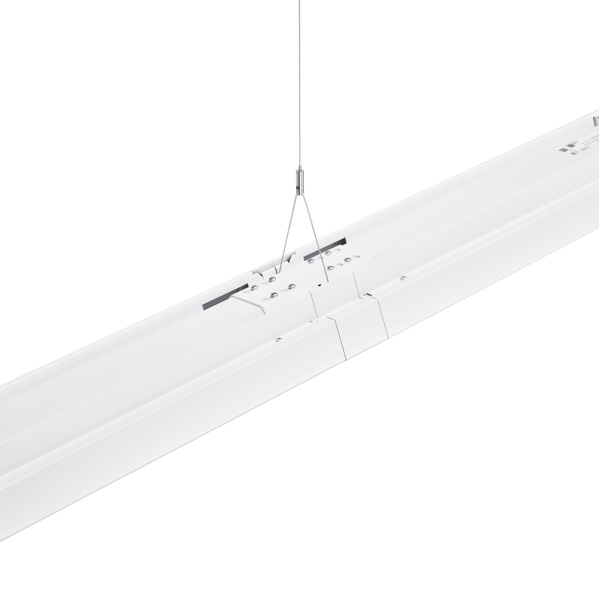 1398x200 mm; H73 mm, Aço, Branco, Branco segurança (RAL9003), Conjunto de suspensão duplo, triângulo, Unidade de fonte de alimentação com interface DALI, 3500 lm, 32.5 W, 108 lm/W, 4000 K, (0.43, 0.40) SDCM 3, CRI90, UGR19, Feixe largo, Texturado, Polimetacrilato de metilo, IP20 | Proteção de dedos, IK02 | 0,2 J standard, Classe de segurança I, Conector de encaixe, 5 polos