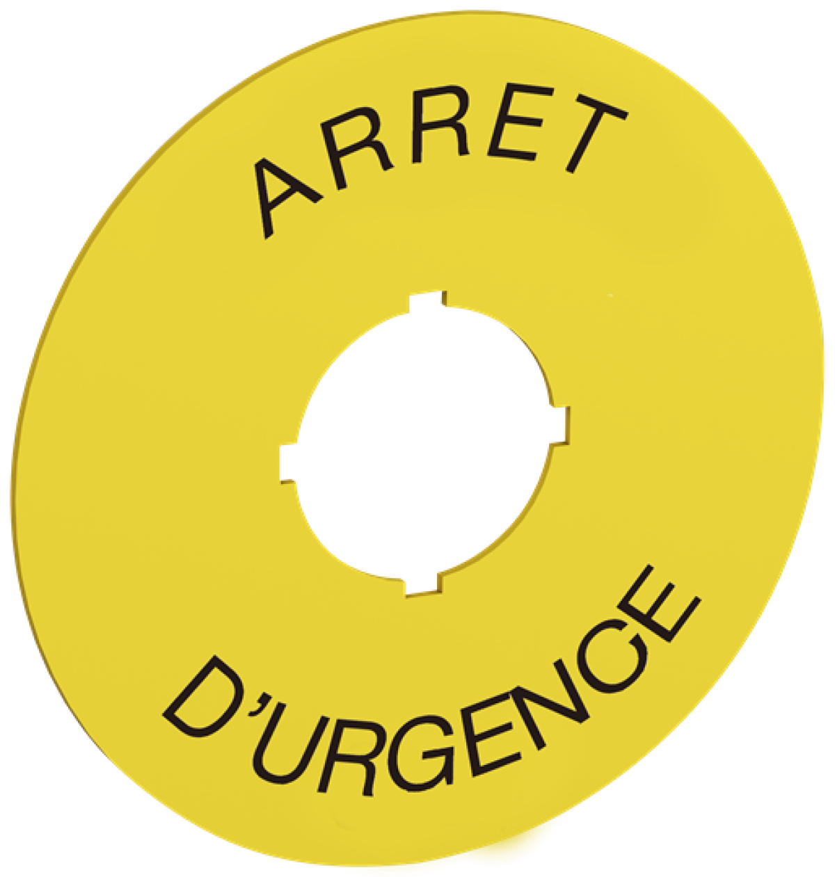 70 mm diameter legend plate for emergency stop. Black text on yellow aluminum with text ARRET D'URGENCE Legend Plate