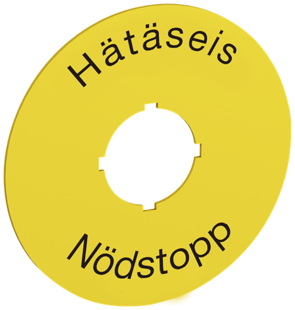 70 mm diameter legend plate for emergency stop. Black text on yellow aluminum with text Hätäseis Legend Plate