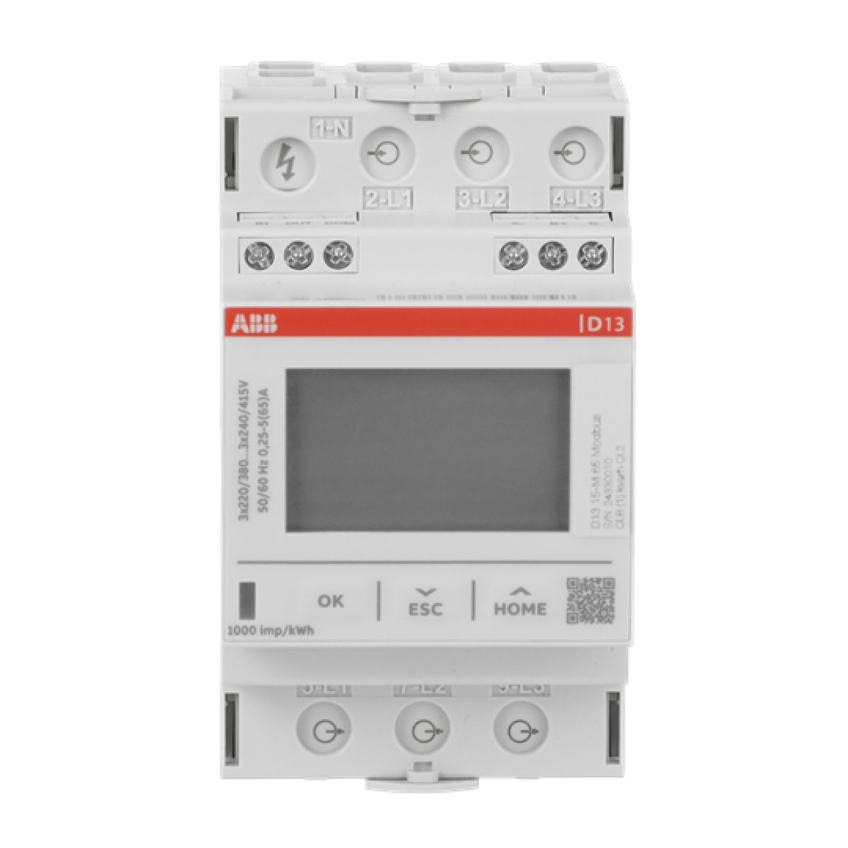 D13 15-M 65 Modbus is a three phase energy meter with Modbus RTU, direct connection up to 65 A, four quadrant metering, class B accuracy for active energy according to MID directive and class 2 for reactive energy according to IEC 62053-23, one digital input and one digital output, only three DIN module in width and housing in recycled plastic.