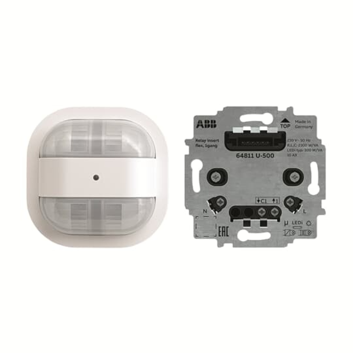 Modular presence detector with corridor lens (set packaging). Rectangular detection range (for installation height of 3 m): walking persons crosswise to the detector up to 24 m x 3 m / frontal/lengthways to the detector up to 14 m x 3 m. Consisting of ABB presence detector flex corridor sensor, 64755-24-500. Consisting of relay insert flex, 1-way 64811 U-500.