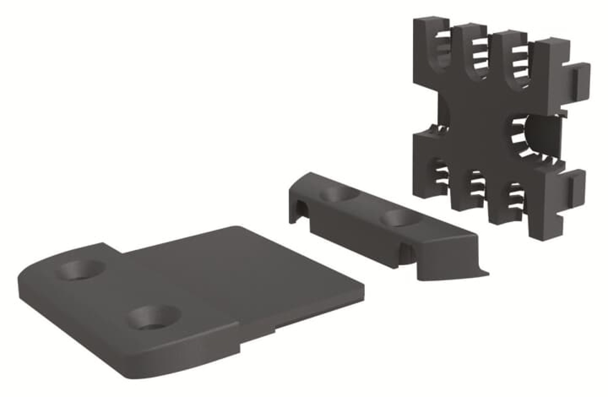 Flat and 90º anchoring accessory with cable outlet side covers.