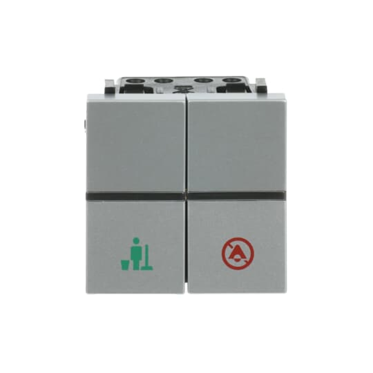 Color: Silver. Rated voltage: 110 - 250 Vac Rated current: 16 AX. Rated power iLED (230/127 Vac): 200/100 W. Interlocked gangs Gang 1: Make Up Room (MUR) green symbol Gang 2: Do Not Disturb (DND) red symbol To control N2180.4 & N2180.5 DND/MUR signaling lights Size: 2 modules.