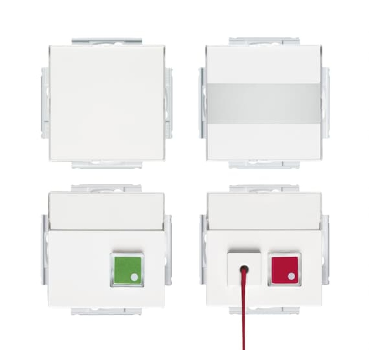 For setting up an emergency call system for handicapped toilets. Consisting of: power supply insert, alarm signalling insert, signal push-button insert with pullcord and cancel-button insert. Activation of alarm signal via cord button. Optical and acoustic emergency-call signalling outside the handicapped toilet. Comforting light when alarm signal is activated. With cancel button for cancelling the emergency call. Size of labelling field sensor: 61 x 20 mm. Size of labelling field transformer/alarm control unit: 61 x 61 mm. For installations according to DIN VDE 0834 a uninterruptible power supply is required.