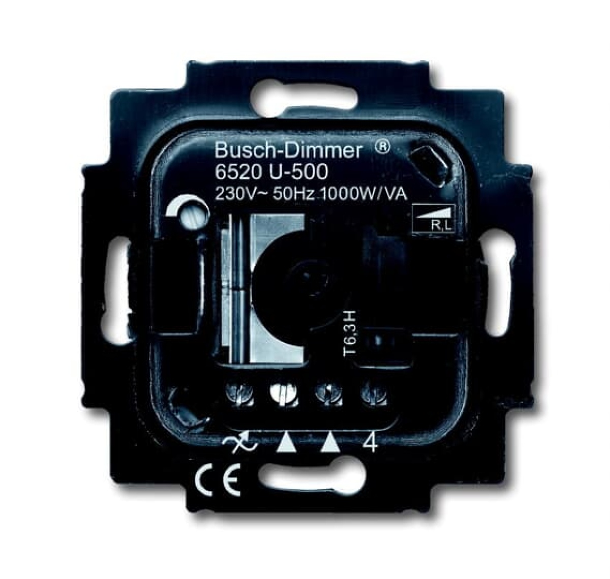 With rotary control, 2way On-Off switching and soft-catch. Leading Edge control. For incandescent lamps, 230 V tungsten halogen lamps and low-volt halogen lamps with conventional transformer. Short-circuit-proof, overload-protected. With adjustable minimum brightness. Without cover plate. Without claws.