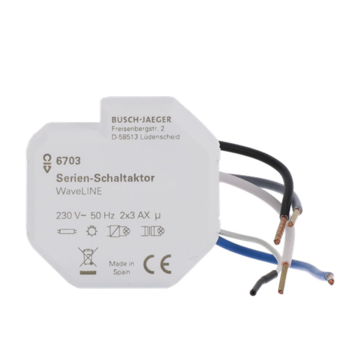 For wireless switching of electrical loads. For operation mode 2gang switch, 2 separate outputs. For operation mode timer: output 1 (eg lighting), output 2: ON/Off delay in dependence of output 1 (eg fan control). For functions: ON/OFF and light scene control. For wall mounted transmitter Waveline 6731-xxx, 6732-xxx und 6733-xxx. For remote control WaveLINE 6780. ON/OFF delay output 2: 2 min. / 30 s. Repeater function can be activated for extended range. For universal attachment or installation. 3 wire connection (neutral conductor required). For installation in (deep) flush-mounted boxes to German Standard DIN 49073. Controllable up to 32 transmission addresses. Send/receive frequency: 868 MHz. Free-field range: approx. 100 m.