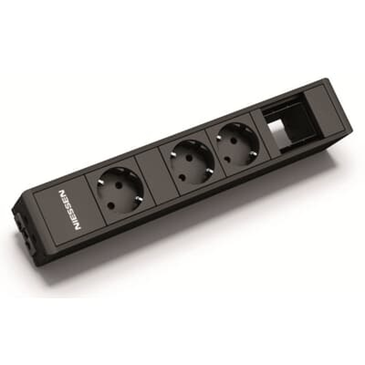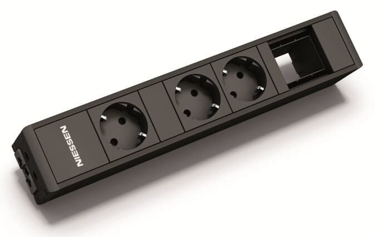 3 Socket outlets fully wired with 2,5mm2 halogen free cable. 1 empty space for customization with VDI connectors (cover plate and connectors not included). Power input through built-in male rapid connector. Mounted on aluminium profile. Set of detachable raised mounting brackets.