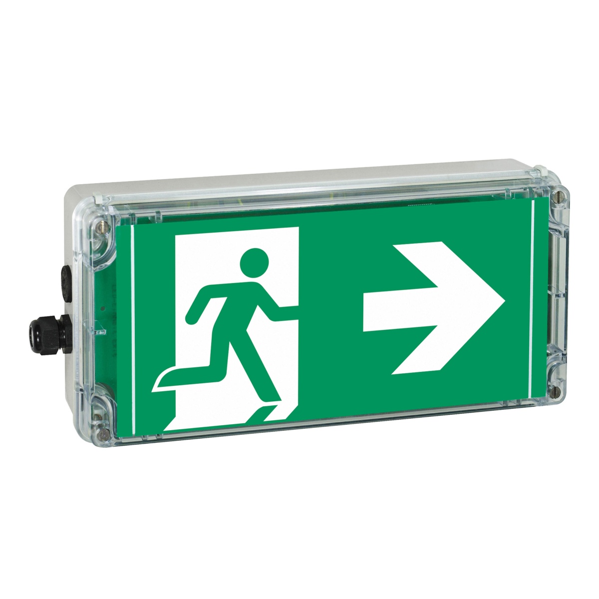 Eaton Crouse-Hinds series EXIT 2 24V exit sign, Arrowhead right, 50-60 Hz, Gray, LED, White letter color, Polycarb, Wall mt, Cover with silk-screen pictogram (arrow 3h), 1 x M20 plastic cable glands, 1 x M20 screw plug, ISO 7010, 12-24 Vdc