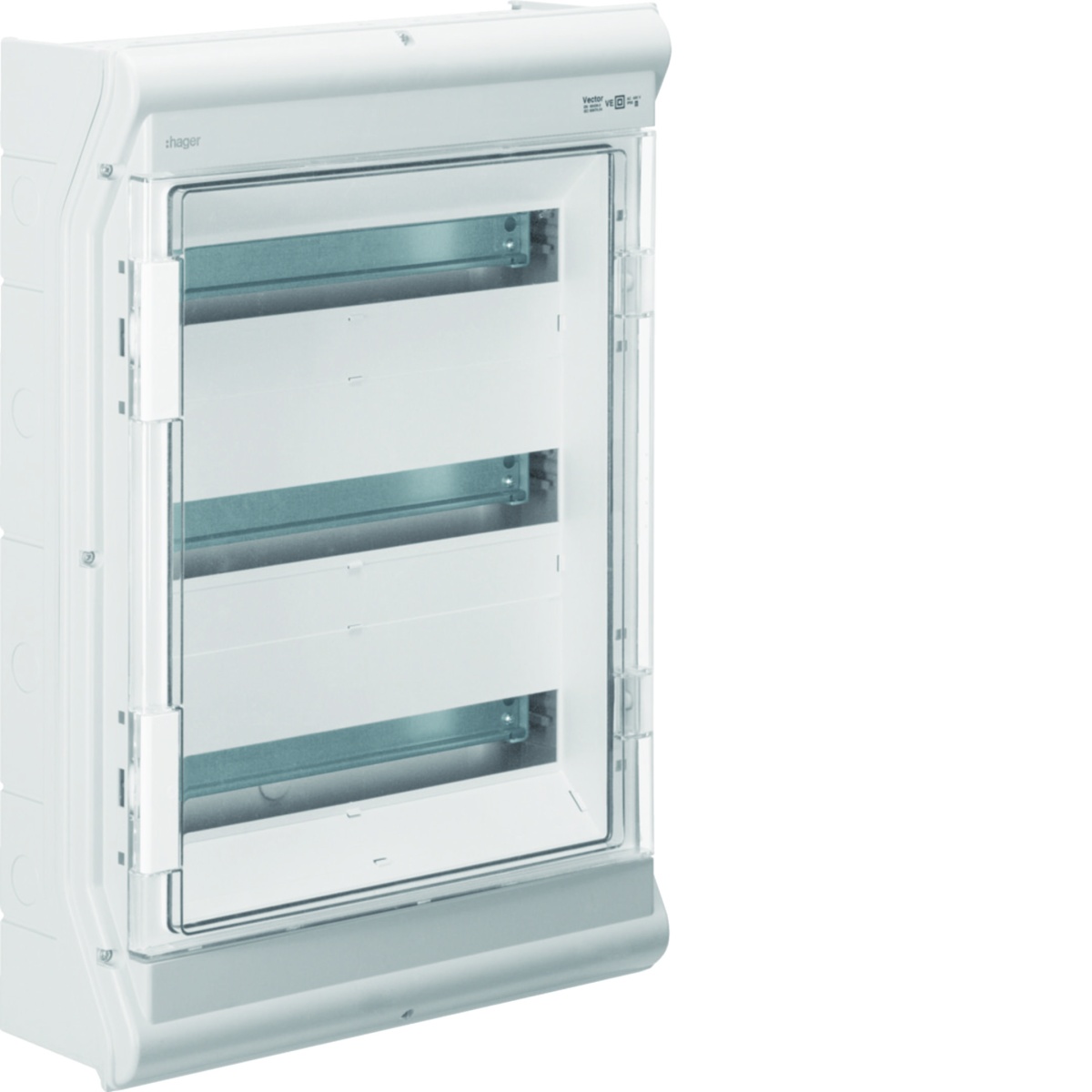 vector estanque IP65 3 filas 54M VE318SN. Caixas estanques , para utilização em ambientes húmidos, agressivos, ou expostos a agentes químicos e raios UV. Com detalhes que facilitam a instalação, como a regulação da calha DIN em profundidade e fixação em paredes irregulares.
