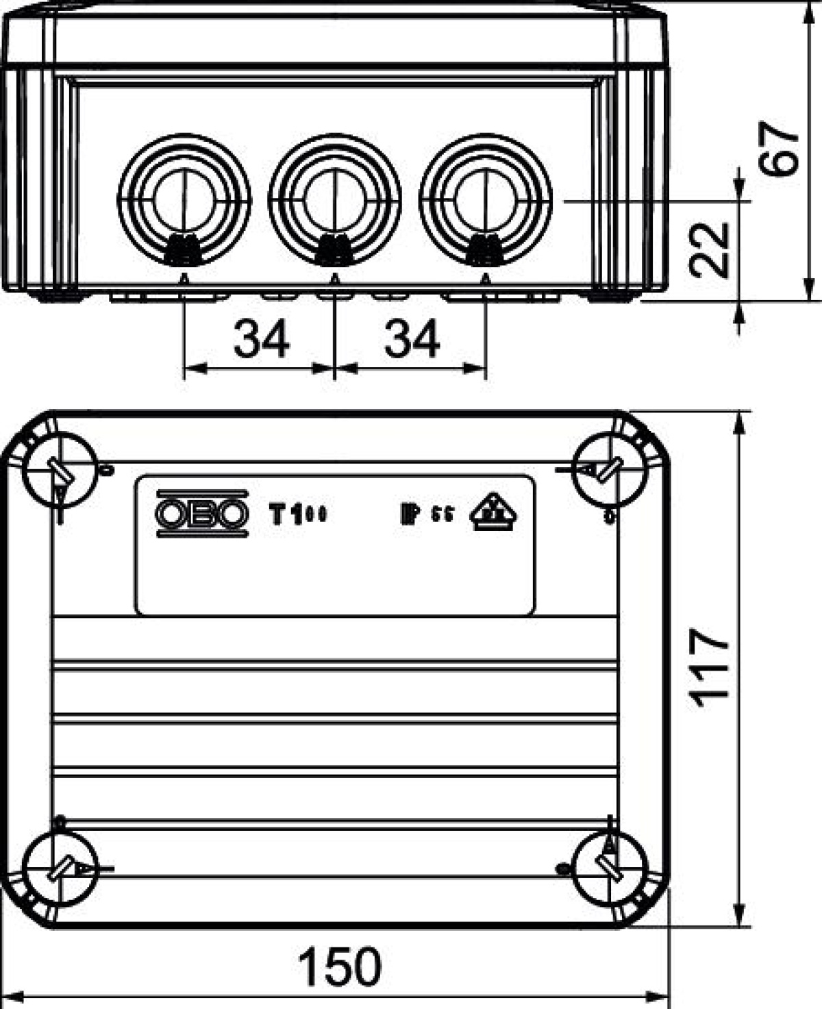 Caixa de derivação com entradas 8xM25 2x M32 150x116x67 Polipropileno cinzento claro RAL 7035