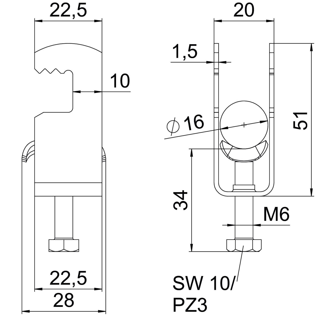 Abraçadeira BBS tipo F, placa de pressão metálica com arestas arredondadas para proteção de cabos. Para montagem vertical e horizontal de 1 cabo individual em ferros planos. Com parafuso simples na placa de pressão, cabeça de parafuso hexagonal universal tam. 10, com fenda e fenda em cruz. Adequado para montagem em áreas interiores e exteriores. Recomenda-se o uso de uma contraplaca.