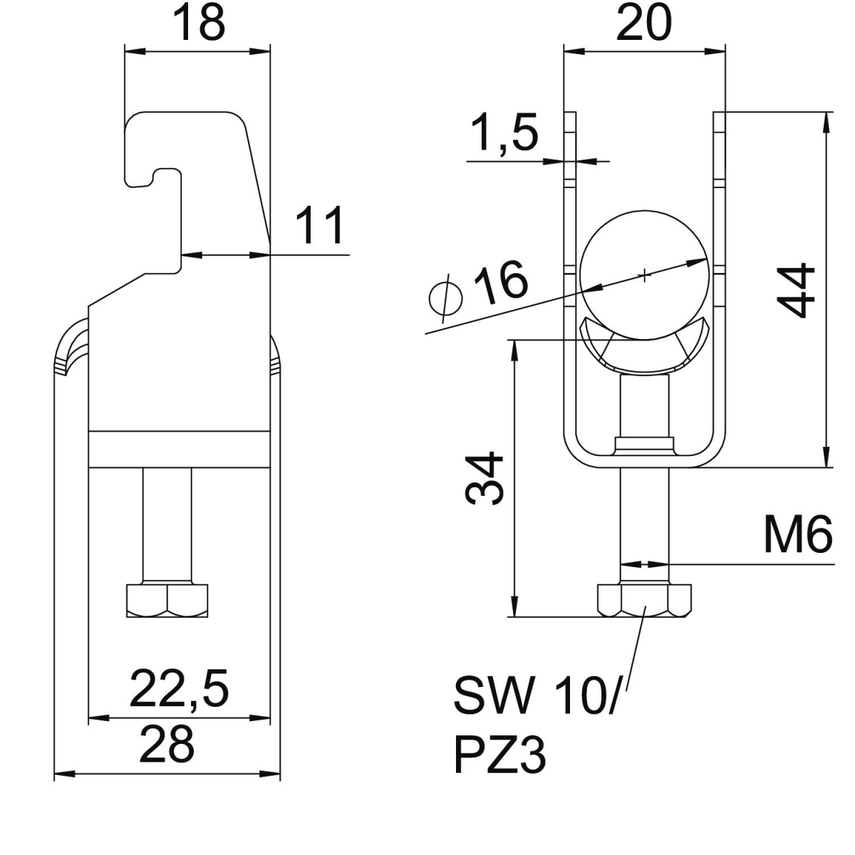 Abraçadeira BBS tipo U, placa de pressão metálica com arestas arredondadas para proteção de cabos. Para montagem vertical e horizontal de 1 cabo individual em perfil C. Para largura de rasgo 18 - 22 mm. Com parafuso simples na placa de pressão, cabeça de parafuso hexagonal universal tam. 10, com fenda e fenda em cruz. Adequada para montagem em áreas interiores e exteriores. Recomenda-se o uso de uma contraplaca.