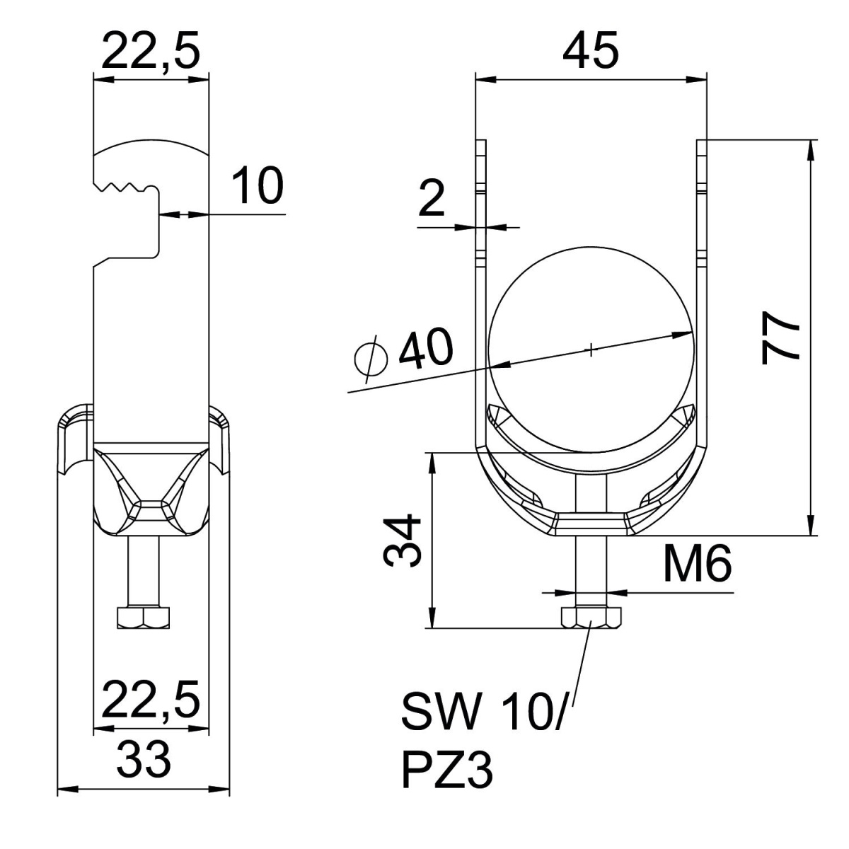 Abraçadeira BBS tipo F, placa de pressão metálica com arestas arredondadas para proteção de cabos. Para montagem vertical e horizontal de 1 cabo individual em ferros planos. Com parafuso simples na placa de pressão, cabeça de parafuso hexagonal universal tam. 10, com fenda e fenda em cruz. Adequado para montagem em áreas interiores e exteriores. Recomenda-se o uso de uma contraplaca.