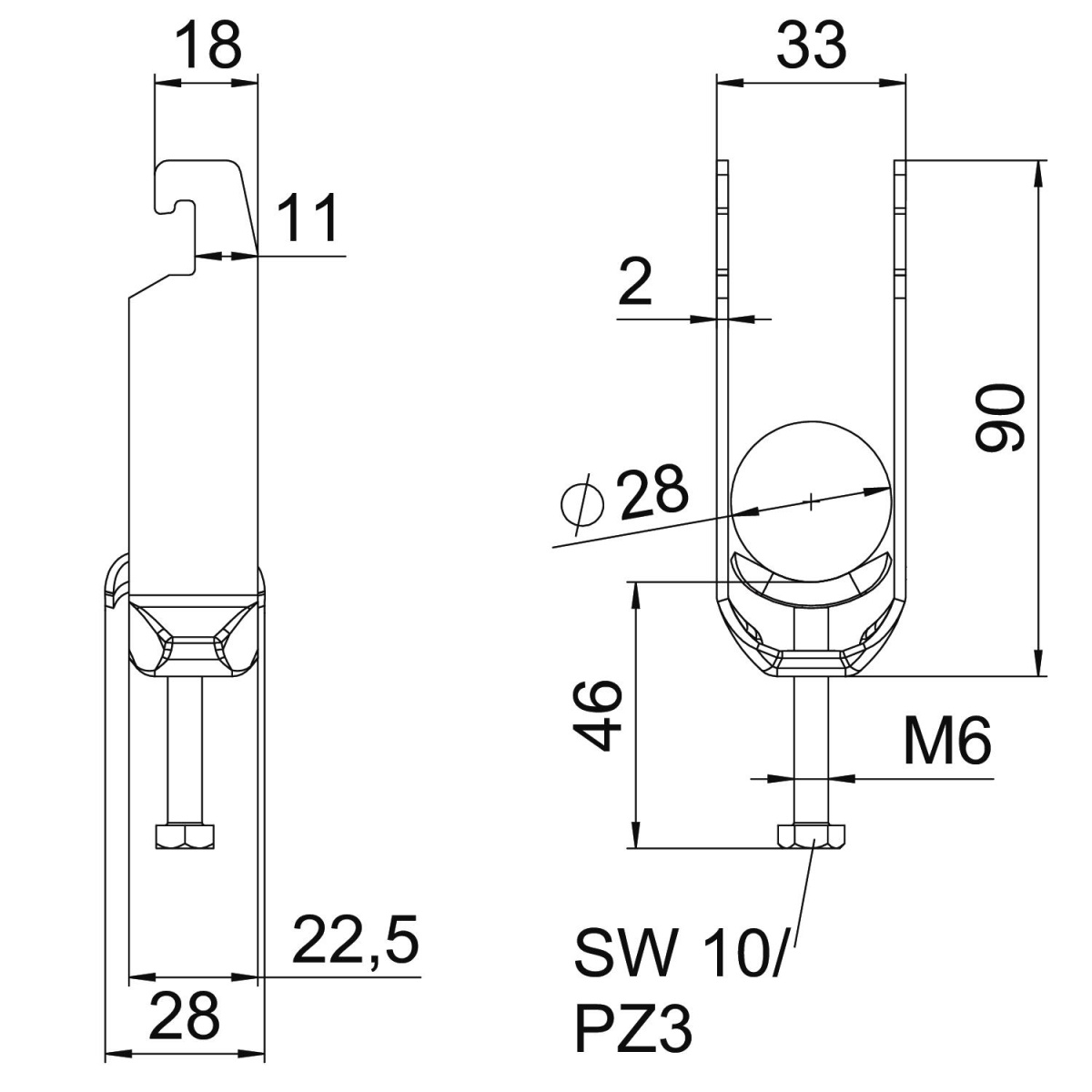 Abraçadeira BBS tipo U, placa de pressão metálica com arestas arredondadas para proteção de cabos. Para montagem vertical e horizontal de 2 cabos individuais em perfil C. Para largura de rasgo 18 - 22 mm. Com parafuso simples na placa de pressão, cabeça de parafuso hexagonal universal tam. 10, com fenda e fenda em cruz. Adequado para montagem em áreas interiores e exteriores.. Vários cabos devem ser separados por placas duplas. Recomenda-se o uso de uma contraplaca.