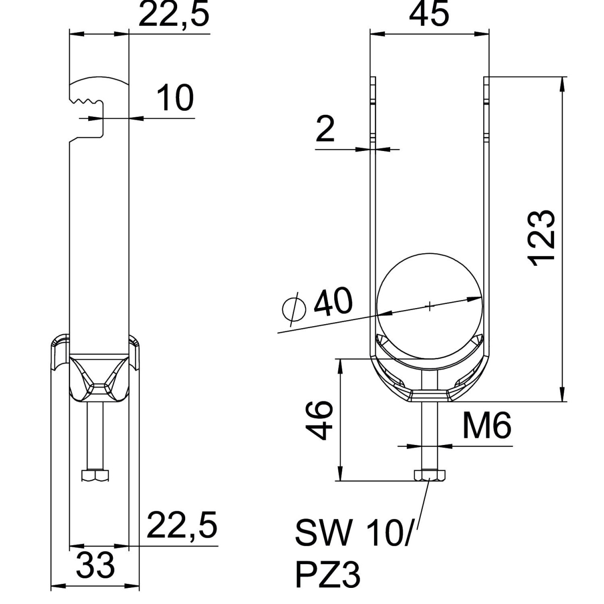 Abraçadeira BBS tipo F, placa de pressão metálica com arestas arredondadas para proteção de cabos. Para montagem vertical e horizontal de 2 cabos individuais em ferros planos. Com parafuso simples na placa de pressão, cabeça de parafuso hexagonal universal tam. 10, com fenda e fenda em cruz. Adequado para montagem em áreas interiores e exteriores. Vários cabos devem ser separados por placas duplas. Recomenda-se o uso de uma contraplaca.