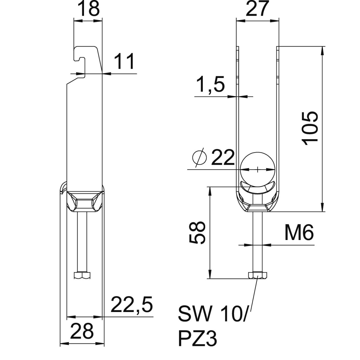 Abraçadeira BBS tipo U, placa de pressão metálica com arestas arredondadas para proteção de cabos. Para montagem vertical e horizontal de 3 cabos individuais em perfil C. Para largura de rasgo 18 - 22 mm. Com parafuso simples na placa de pressão, cabeça de parafuso hexagonal universal tam. 10, com fenda e fenda em cruz. Adequado para montagem em áreas interiores e exteriores.. Vários cabos devem ser separados por placas duplas. Recomenda-se o uso de uma contraplaca.