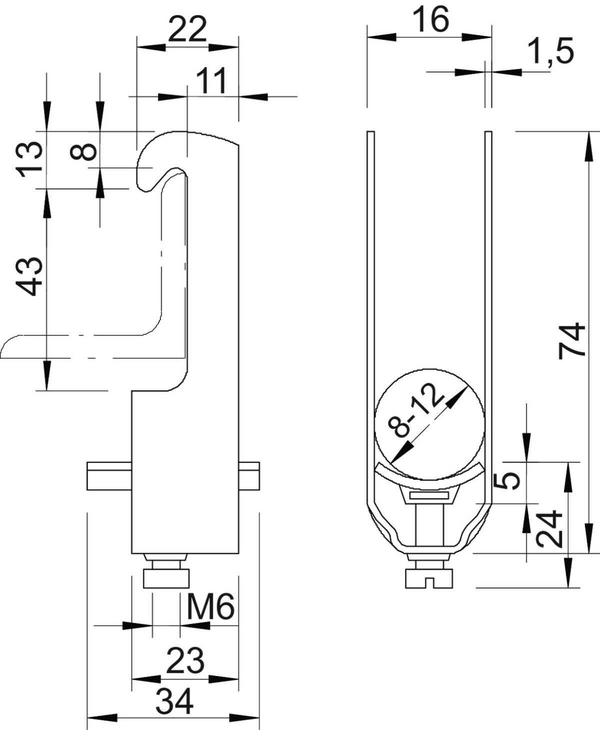 Adequada para barra de ferro angular com altura lateral de 40 mm de comprimento. Abraçadeira e parafuso em aço galvanizado a quente após maquinação. Placa em polipropileno, livre de halogéneos, cinzento claro RAL 7035.