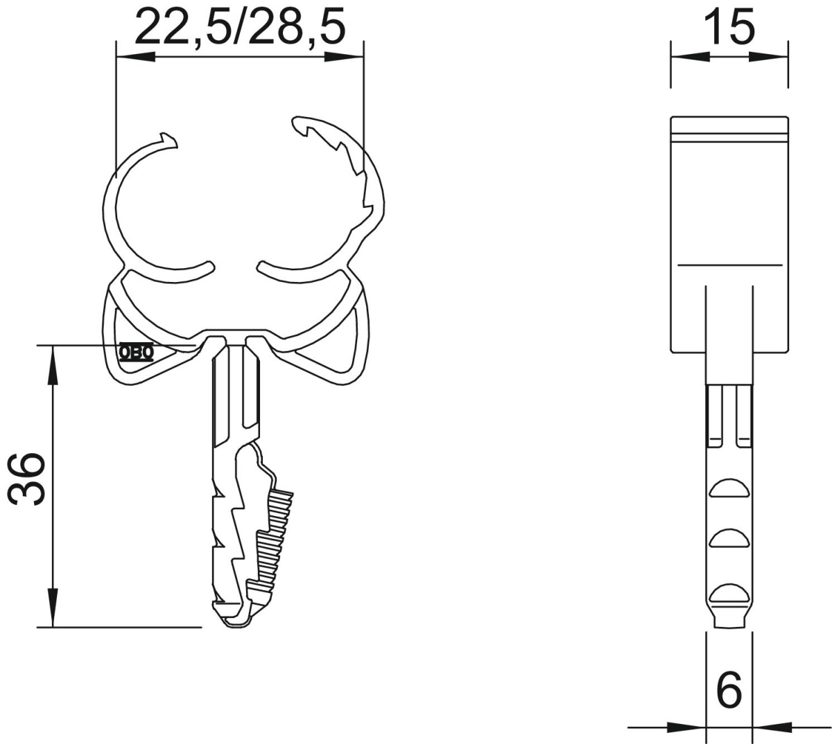 Com bucha com batente para montagem rápida em paredes de betão e alvenaria. Inserir a bucha no furo até ao encosto da aresta inferior da abraçadeira, ao pressionar o tubo, a abraçadeira fecha e encaixa autonomamente em torno do tubo.