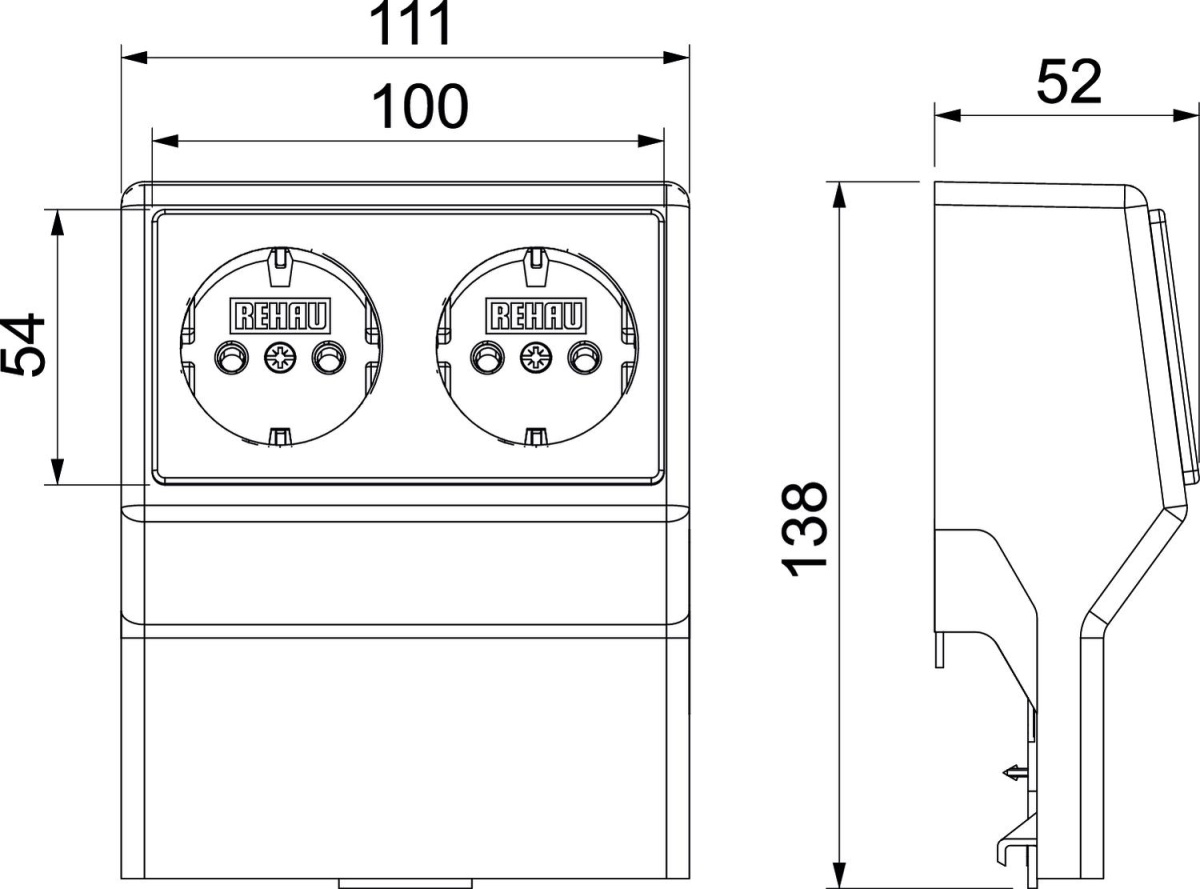Caixa de aparelhagem com tomada Schuko dupla pré-montada para a calha de rodapés nas larguras de calha de 50 e 70 mm.