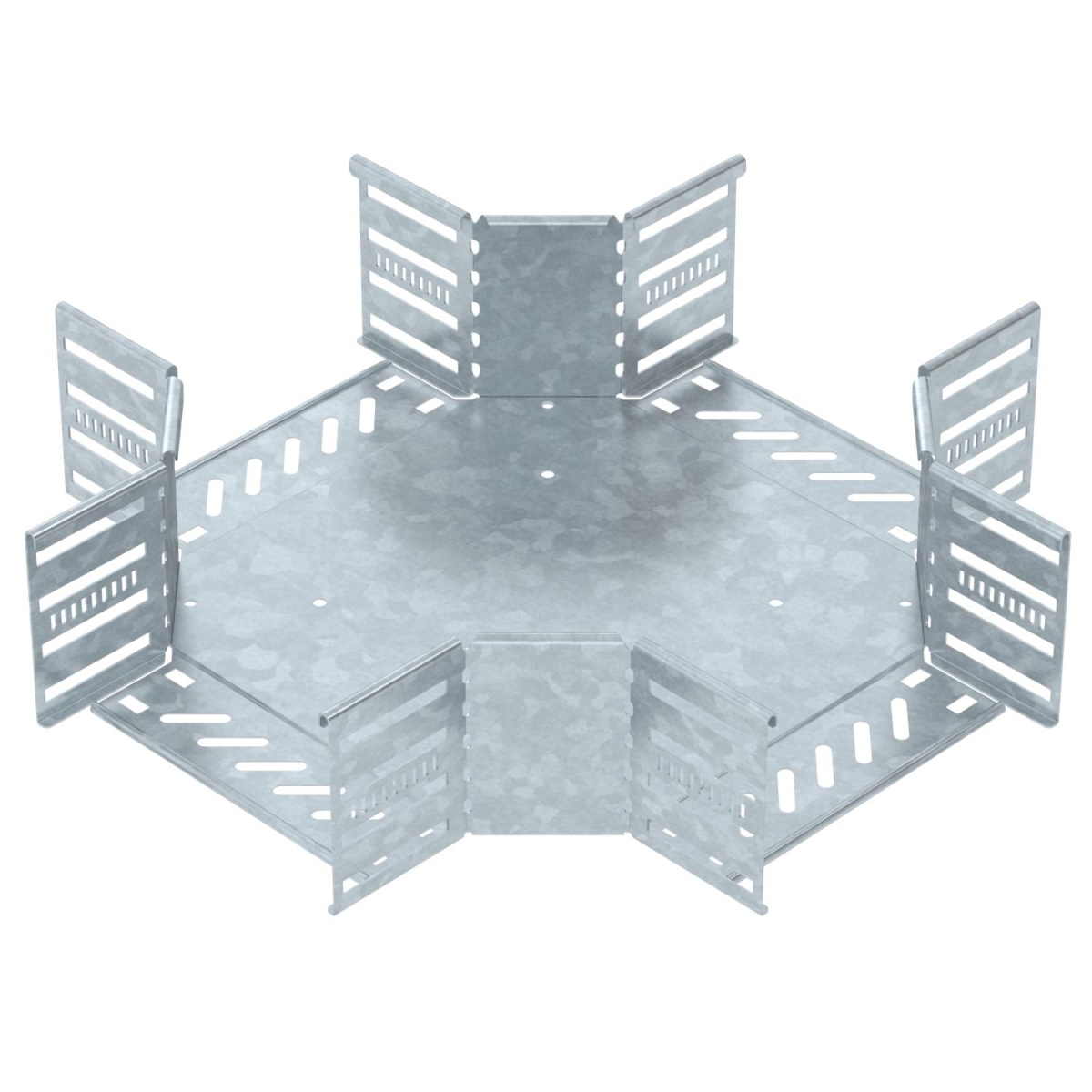 Cruzeta para a criação de um ramal horizontal, para caminhos de cabos em chapa de encaixe e de aparafusar, altura lateral de 110 mm. Montagem sem parafusos com grampos duplos ou ligação roscada com parafusos de cabeça boleada FRS e porcas combinadas M6. Indicado para áreas interiores e exteriores. O material de fixação terá que ser encomendado em separado.