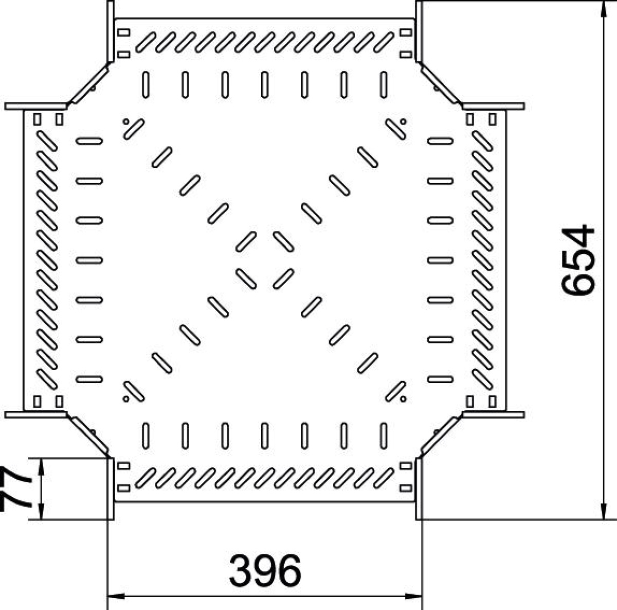 Cruzeta para a criação de um ramal horizontal, para caminhos de cabos em chapa de encaixe e de aparafusar, altura lateral de 110 mm. Montagem sem parafusos com grampos duplos ou ligação roscada com parafusos de cabeça boleada FRS e porcas combinadas M6. Indicado para áreas interiores e exteriores. O material de fixação terá que ser encomendado em separado.