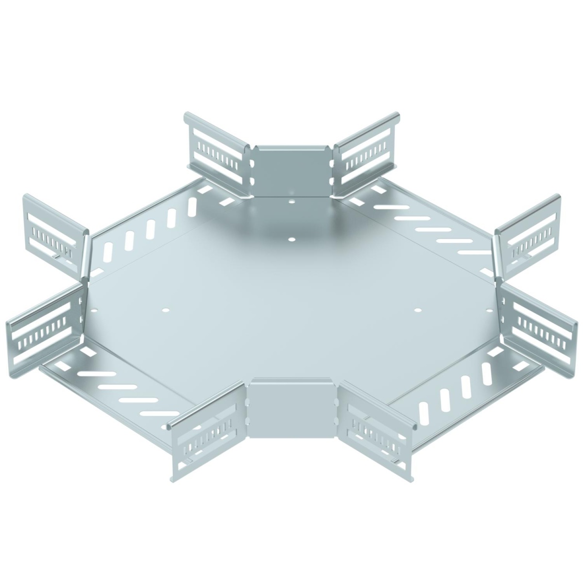 Cruzeta para a criação de um ramal horizontal, para caminhos de cabos em chapa de encaixe e de aparafusar, altura lateral de 60 mm. Montagem sem parafusos com grampos duplos ou ligação roscada com parafusos de cabeça boleada FRS e porcas combinadas M6. Aplicável em áreas interiores. O material de fixação terá que ser encomendado em separado.