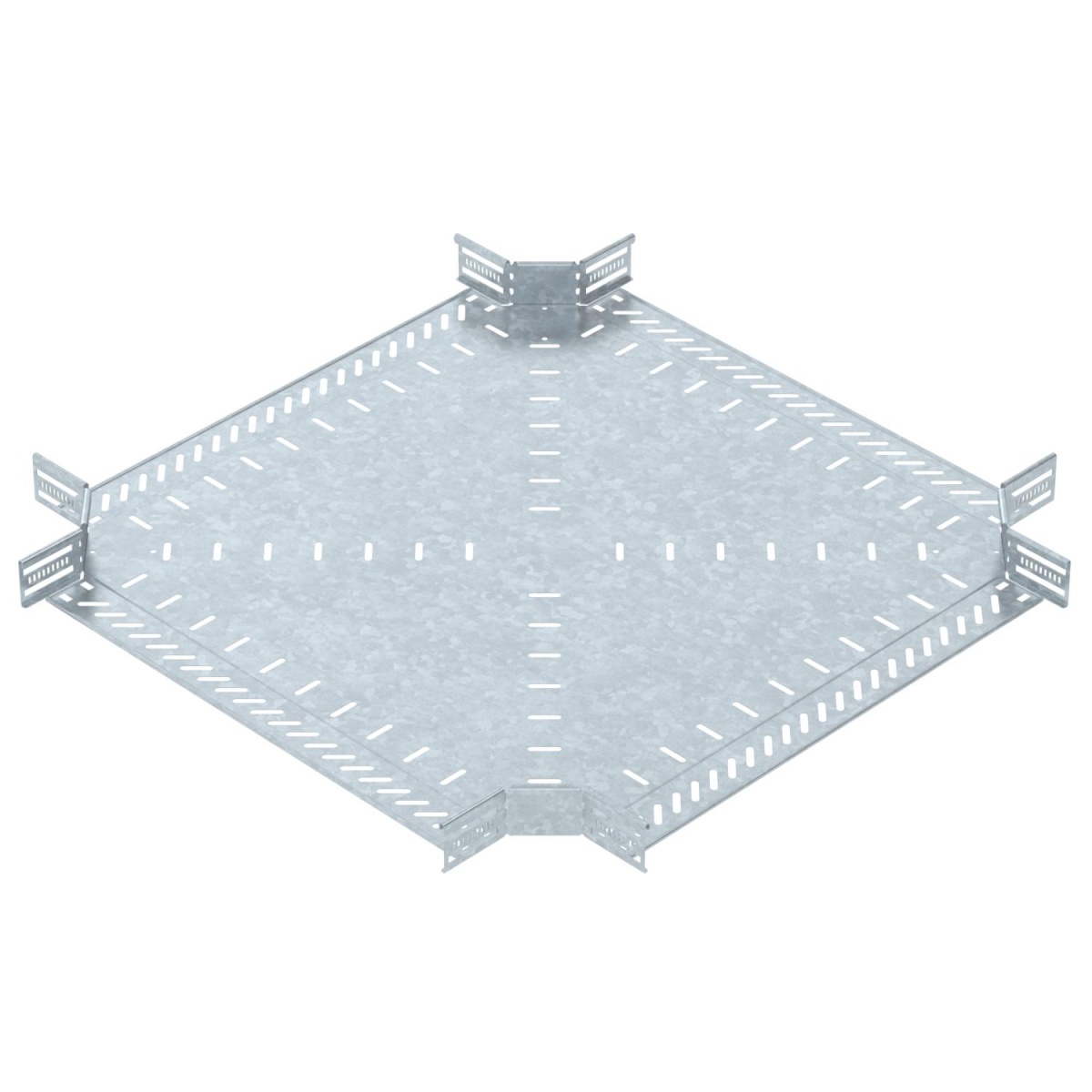 Cruzeta para a criação de um ramal horizontal, para caminhos de cabos em chapa de encaixe e de aparafusar, altura lateral de 60 mm. Montagem sem parafusos com grampos duplos ou ligação roscada com parafusos de cabeça boleada FRS e porcas combinadas M6. Indicado para áreas interiores e exteriores. O material de fixação terá que ser encomendado em separado.