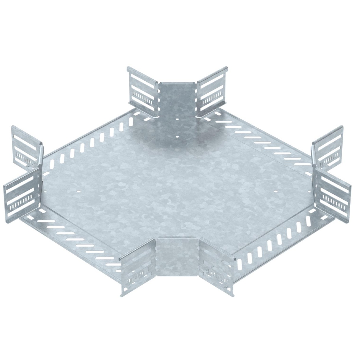 Cruzeta para a criação de um ramal horizontal, para caminhos de cabos em chapa de encaixe e de aparafusar, altura lateral de 85 mm. Montagem sem parafusos com grampos duplos ou ligação roscada com parafusos de cabeça boleada FRS e porcas combinadas M6. Indicado para áreas interiores e exteriores. O material de fixação terá que ser encomendado em separado.