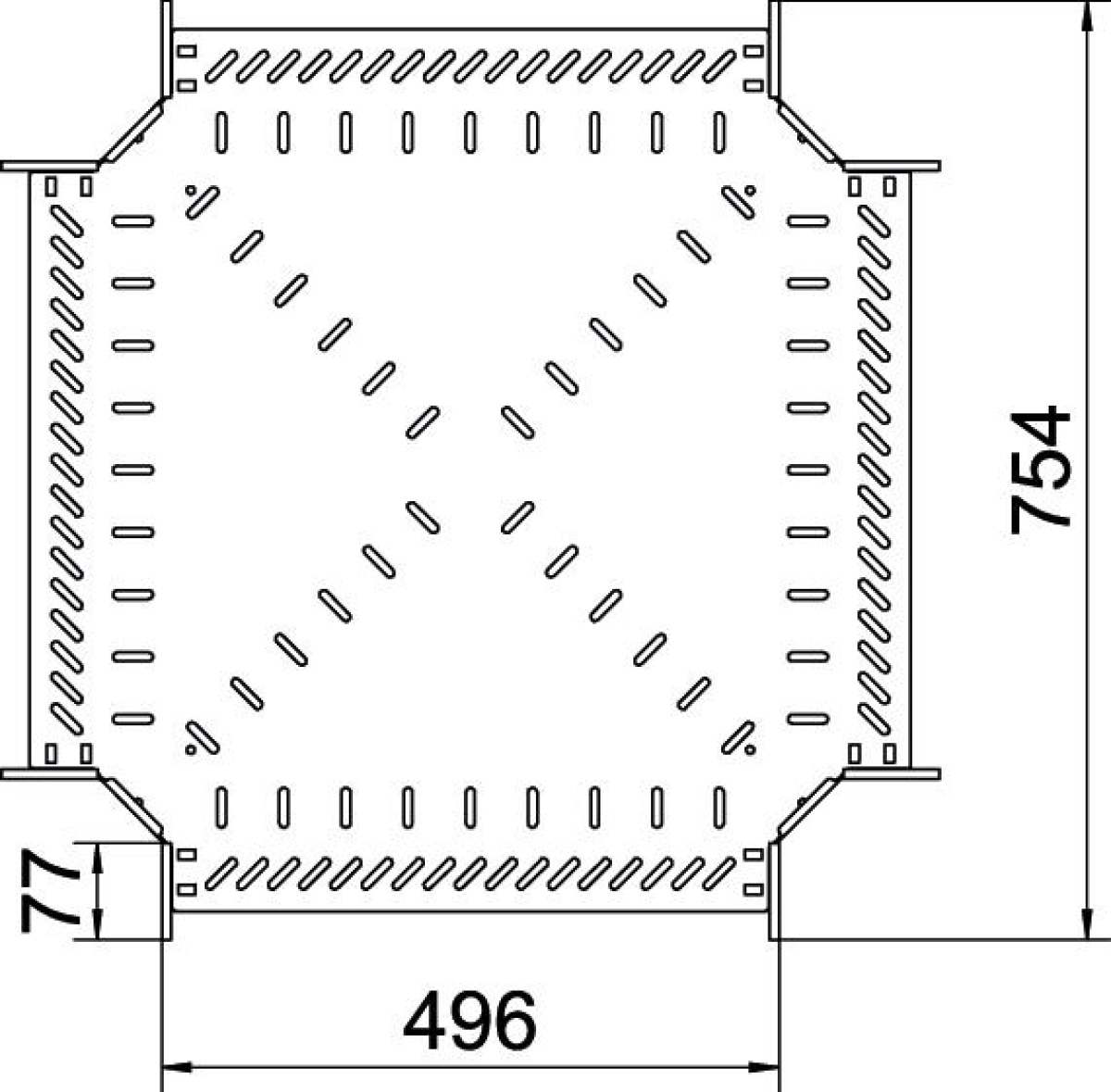 Cruzeta para a criação de um ramal horizontal, para caminhos de cabos em chapa de encaixe e de aparafusar, altura lateral de 85 mm. Montagem sem parafusos com grampos duplos ou ligação roscada com parafusos de cabeça boleada FRS e porcas combinadas M6. Aplicável em áreas interiores. O material de fixação terá que ser encomendado em separado.
