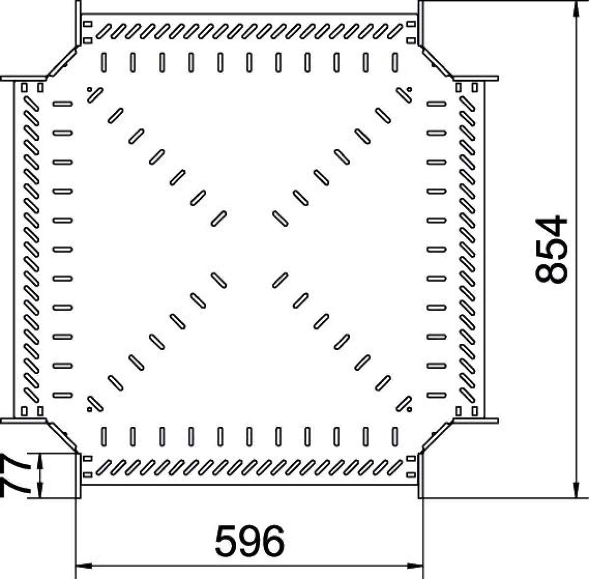 Cruzeta para a criação de um ramal horizontal, para caminhos de cabos em chapa de encaixe e de aparafusar, altura lateral de 85 mm. Montagem sem parafusos com grampos duplos ou ligação roscada com parafusos de cabeça boleada FRS e porcas combinadas M6. Indicado para áreas interiores e exteriores. O material de fixação terá que ser encomendado em separado.