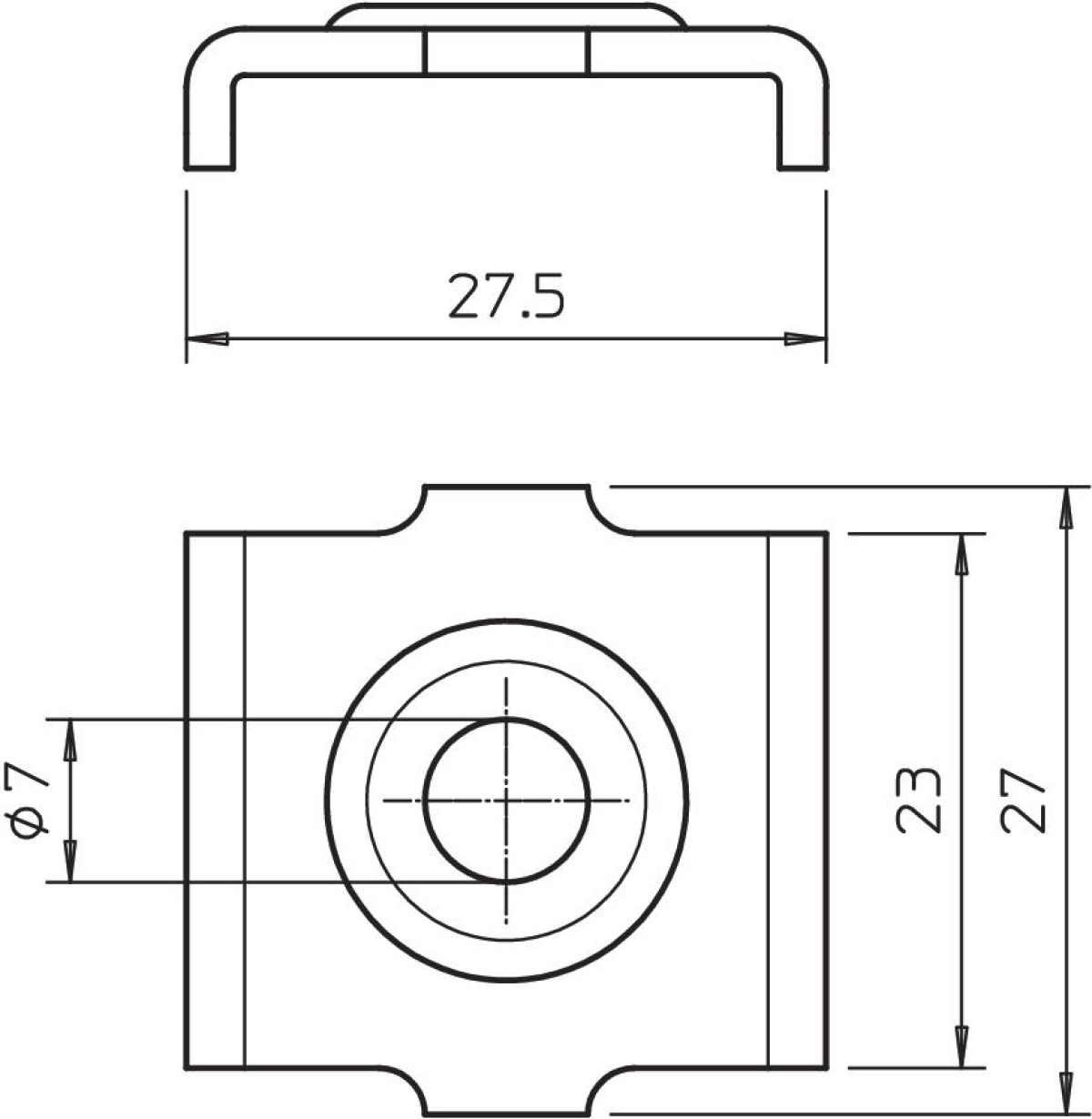Peça de aperto para a fixação no pavimento de caminhos de cabos em varão de 50 mm de largura.