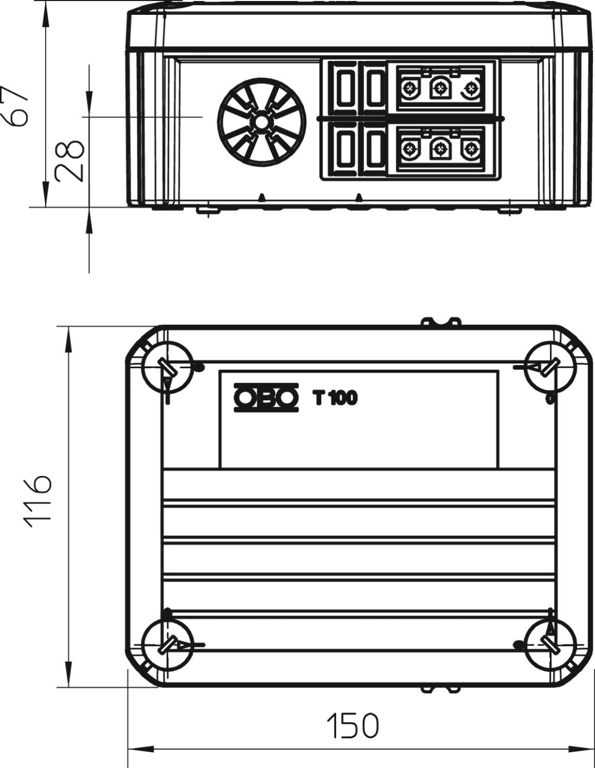 Caixa de derivação com ficha Wieland 1s4 3B3 para conectar cabos e condutas em áreas interiores e áreas exteriores protegidas. Formato retangular com entradas quebráveis nas laterais e entradas quebráveis na base. Adequado para a montagem na parede / teto e para a montagem em suportes para caixas de derivação. Com opção de fixação interna e montagem através de parafusos nos cantos. Tampa com fecho rápido, pode ser selada a chumbo. Fabricada em materiais resistentes aos raios UV e livres de halogéneo. Caixa de derivação de acordo com a DIN EN 60670. Resistente ao fio incandescente segundo a DIN EN 60695-2-11, temperatura de ensaio 650 °C.