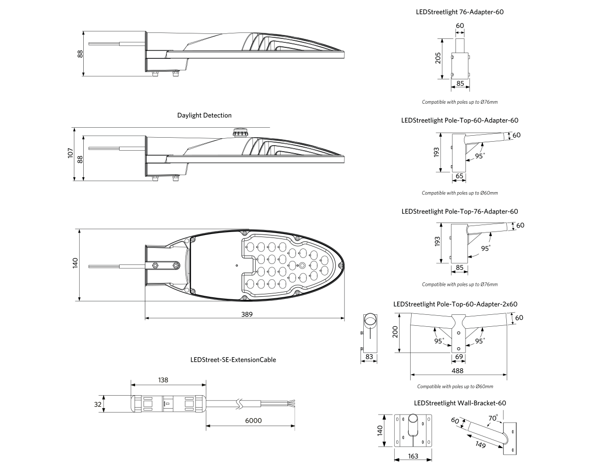Design streetlight luminaire with optimised optical configuration. Accessories available for many pole types and connections. IP66 and suitable for use on coastal applications. Now with 42-60mm pole entry.