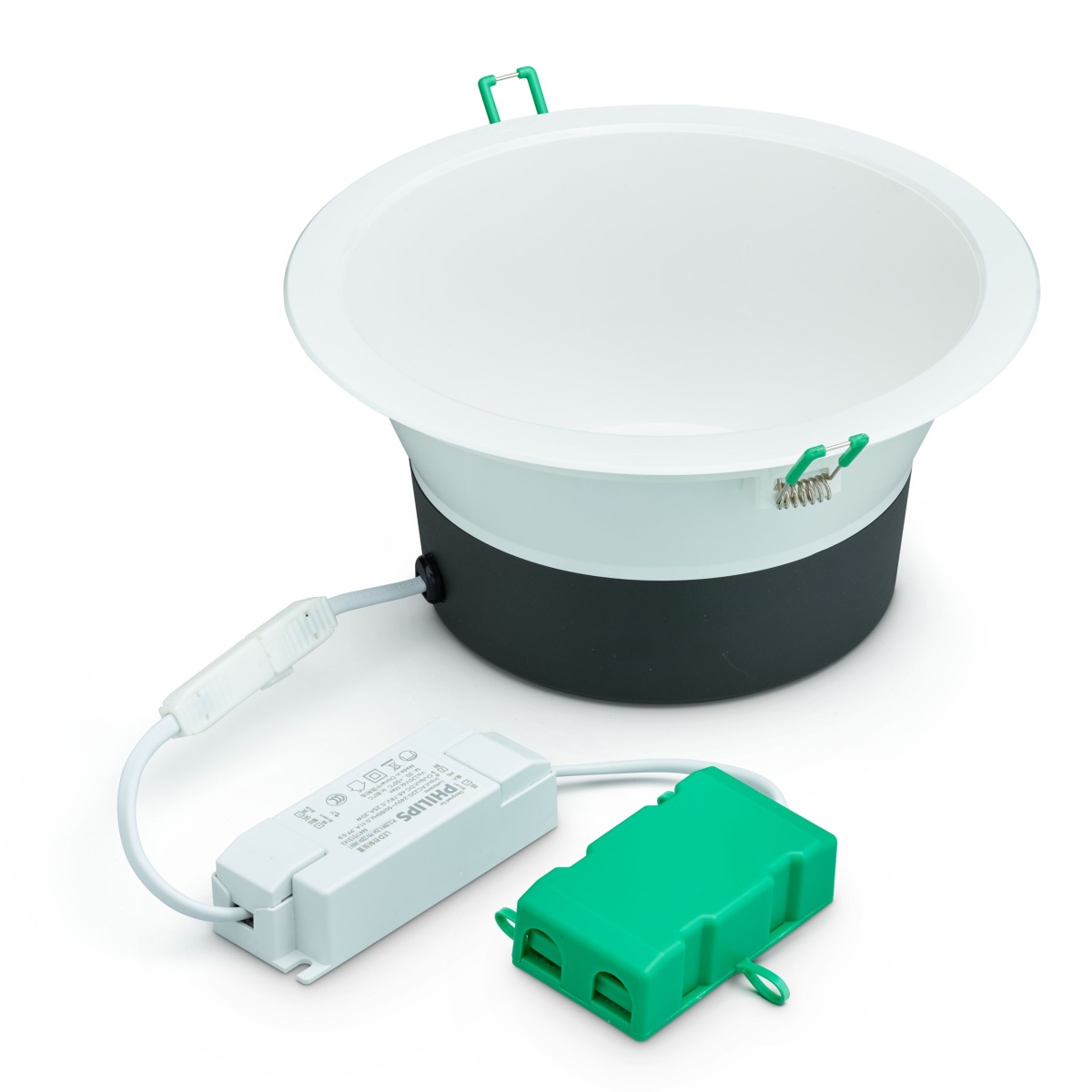 D150 mm, Policarbonato, Branco, Branco puro (RAL9010), Unidade de fonte de alimentação externa (aceso/apagado), 1200 lm, 9.8 W, 120 lm/W, 3000 K, (0.432,0.404) SDCM≦5, Refletor branco, Policarbonato, IP20 | Proteção de dedos, IK02 | 0,2 J standard, Classe de segurança II, 2 cabos de 0,15 m com conectores, 2 polos, Conector de encaixe, 4 polos