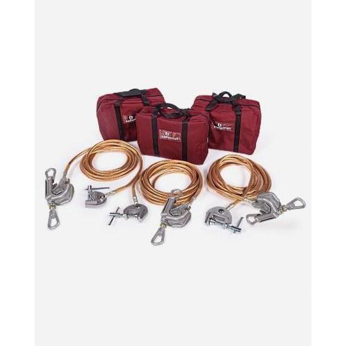 Equipo de puesta a tierra y cortocircuito de fases para líneas aéreas de alta tensión. El objetivo principal de su instalación es la protección del trabajador ante la puesta en funcionamiento accidental o un posible retorno de tensión durante los trabajos de reparación. Según norma IEC 61230. Compuesto por 3 pinzas TML de aleación de aluminio y apriete por tornillo para conductores cilíndricos de diámetro comprendido entre 10 y 70 mm, 3 cables de cobre con aislamiento de PVC. Sección y longitud según modelo, 3 tornos de puesta a tierra TT-50 y 3 fundas para el transporte y almacenamiento del equipo.